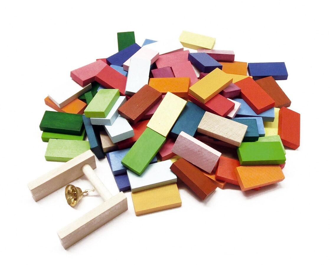 Dřevěná dráha se skládá z pestrobarevných kamenů ze dřeva a "branky" se zvonečkem. Poskládej všechny kameny do řady za sebe tak, aby jsi cvrnknutím do prvního, shodil všechny a na konci rozezvonil zvoneček. Stavebnice rozvíjí motoriku rukou, kreativitu a trpělivost dětí.