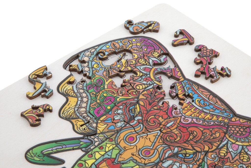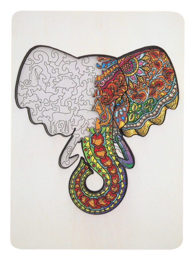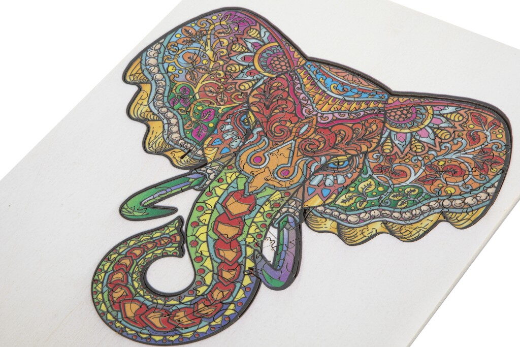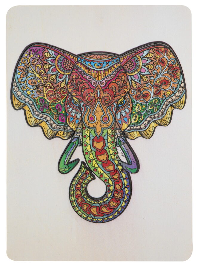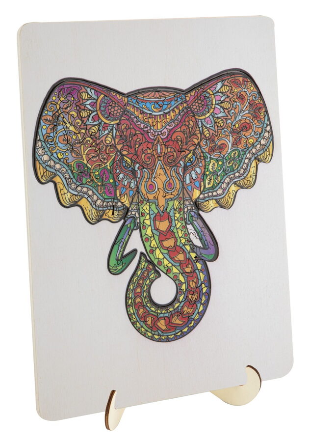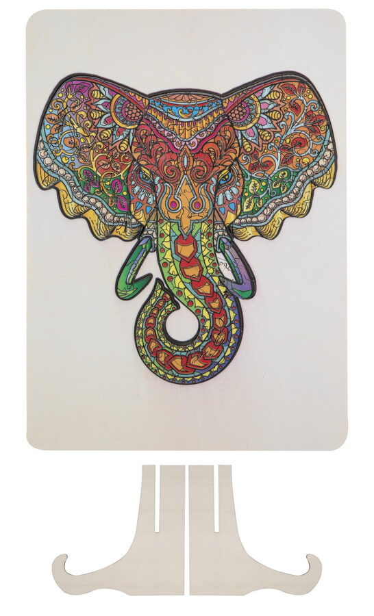 Dřevěné mozaikové puzzle se stojánkem v designu Slon. Puzzle se skládají ze 132 jedinečně tvarovaných dílků a složené puzzle lze poté umístit na přiložený dřevěný stojan. Rozměry: 30 × 22 centimetrů. Vhodné od 7 let.