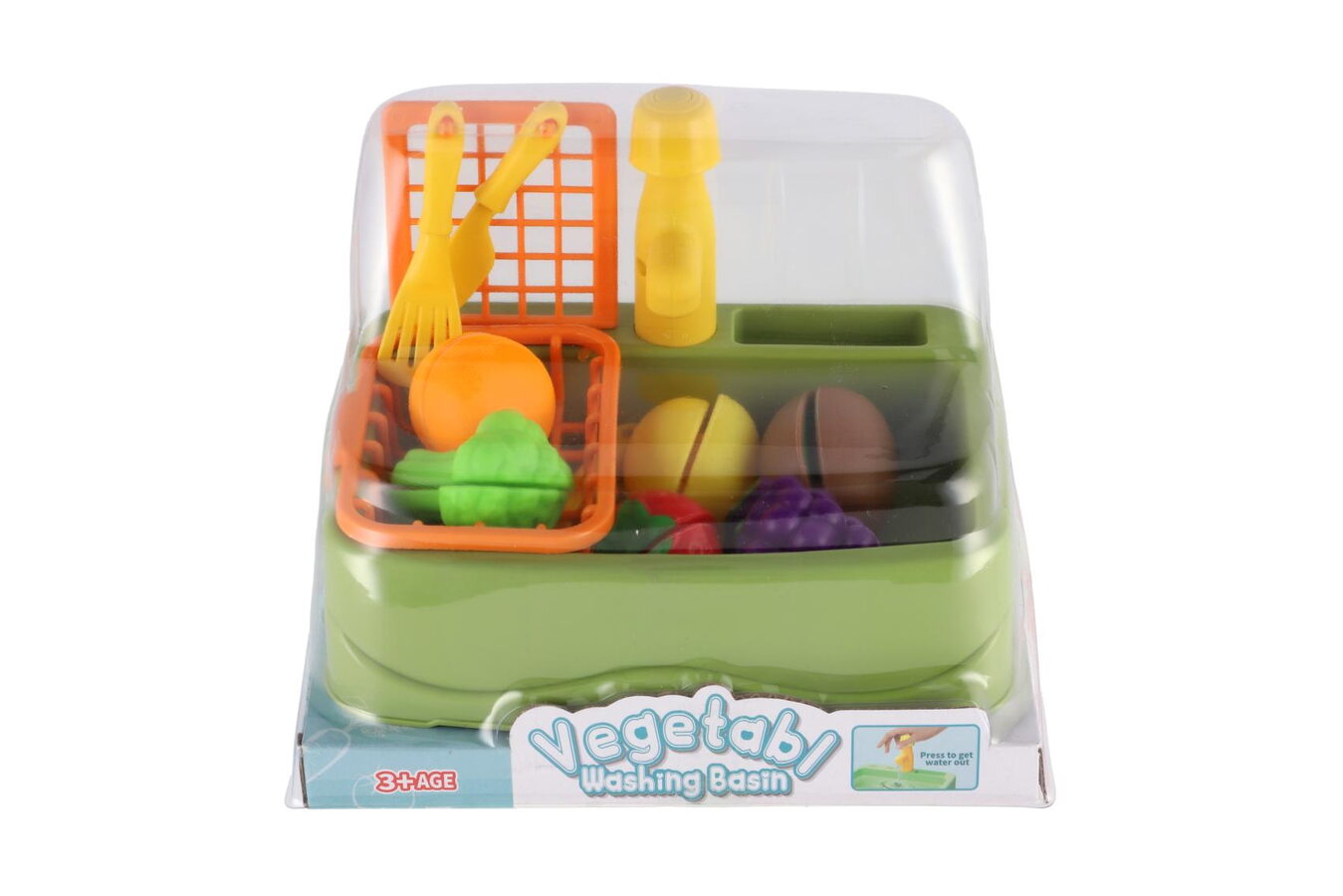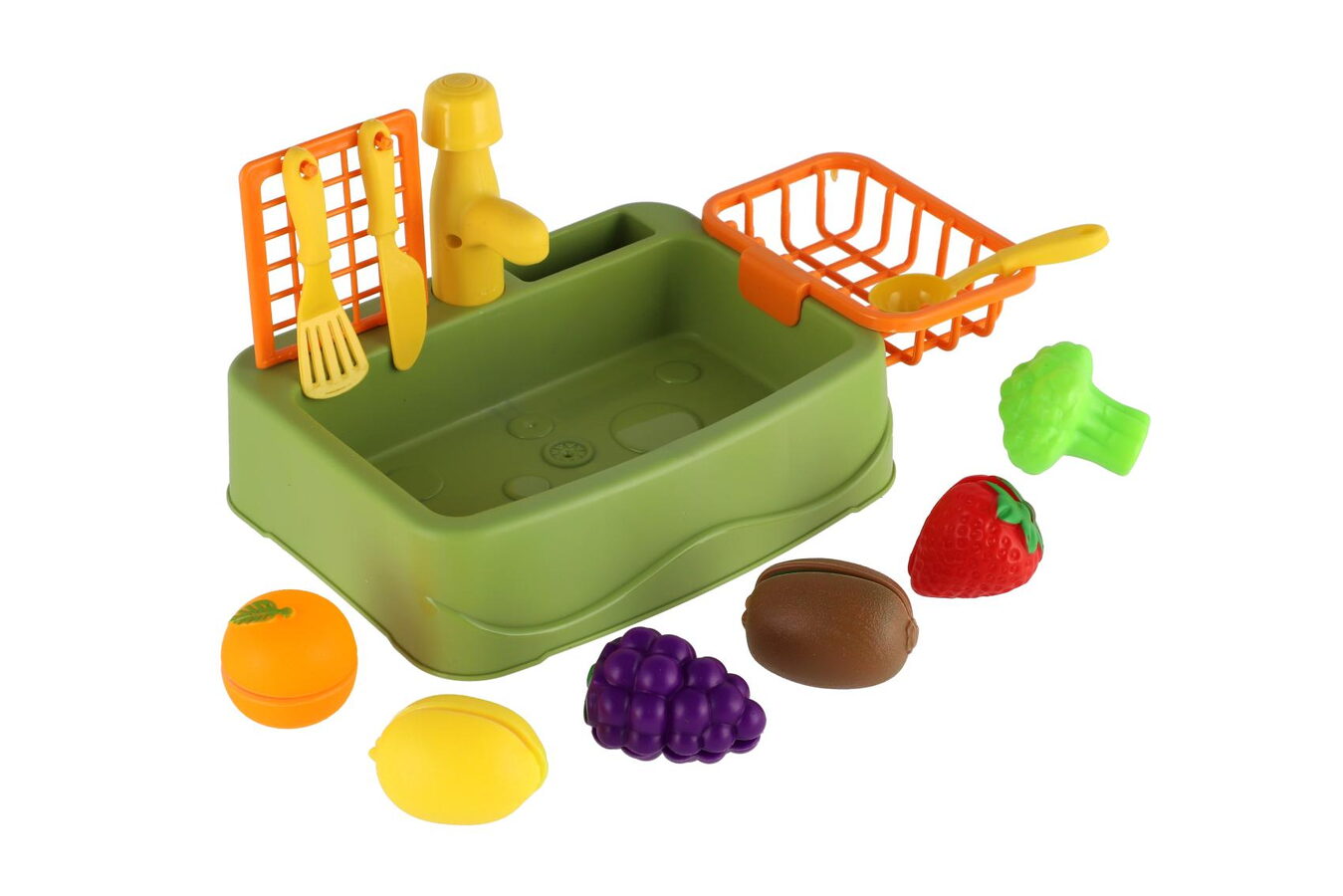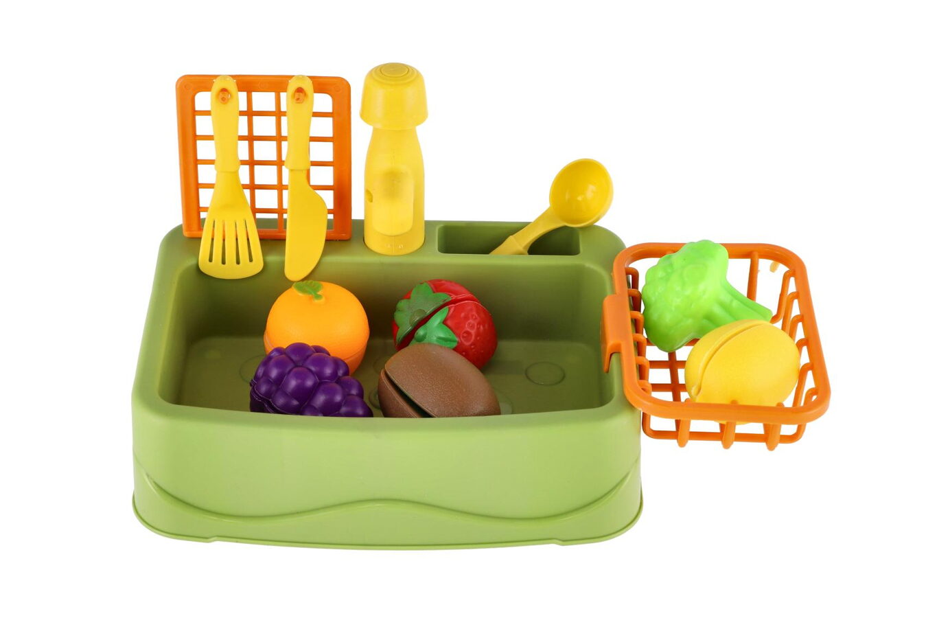 Dřez na mytí nádobí pro malé hospodyňky. Sada obsahuje krájecí ovoce a doplňky. Kohoutek na vodu je formou pumpičky.