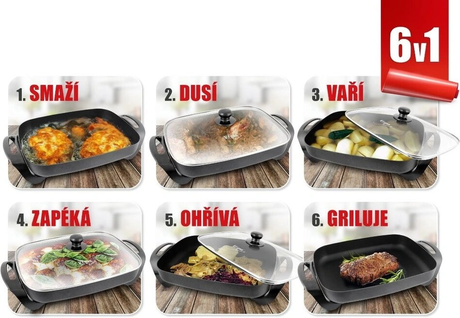 Elektrická víceúčelová pánev 40 x 33 cm s velkou hloubkou 7 cm, pro pohodlnou přípravu většího množství potravin. Pánev 6 v 1 dokáže nahradit několik spotřebičů - smaží, dusí, vaří, zapéká, ohřívá a griluje. Má široké využití nejen v domácnosti, na chalupě, ale i na dovolené. Zdravé a chutné pokrmy připravíte rychle, efektivně a kdekoli. Speciální nepřilnavý povrch pro zdravé vaření bez tuku a oleje se zároveň i velmi snadno čistí.