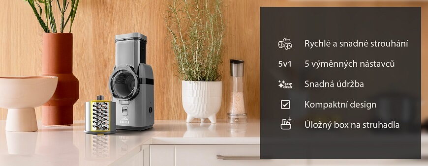 Elektrický strouhač ETA Grata 5079 90000 v nenápadném šedém provedení vám pomůže rychle a efektivně nakrájet potraviny. Během chvilky budete mít nastrouhané brambory na bramboráky, jablka na štrúdl, sýr na špagety nebo strouhanku na řízky. Usnadněte si práci v kuchyni a pořiďte si tohoto šikovného pomocníka. K dispozici budete mít až 5 výměnných nástavců a dva plnicí otvory o velikostech 9 a 7 cm, můžete se tak pustit i do zpracování větších kusů potravin. O vždy perfektní výsledky se pak postará silný DC motor. Údržba i čištění strouhače jsou snadné a pro přehledné uskladnění nástavců najdete v balení i praktický box.