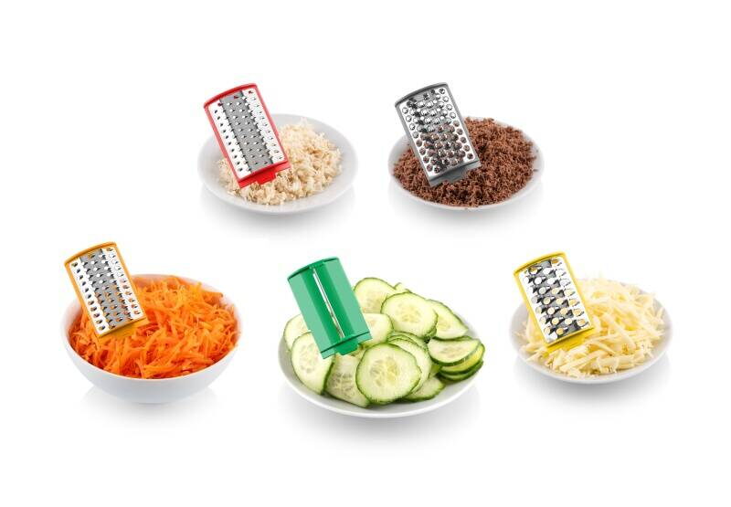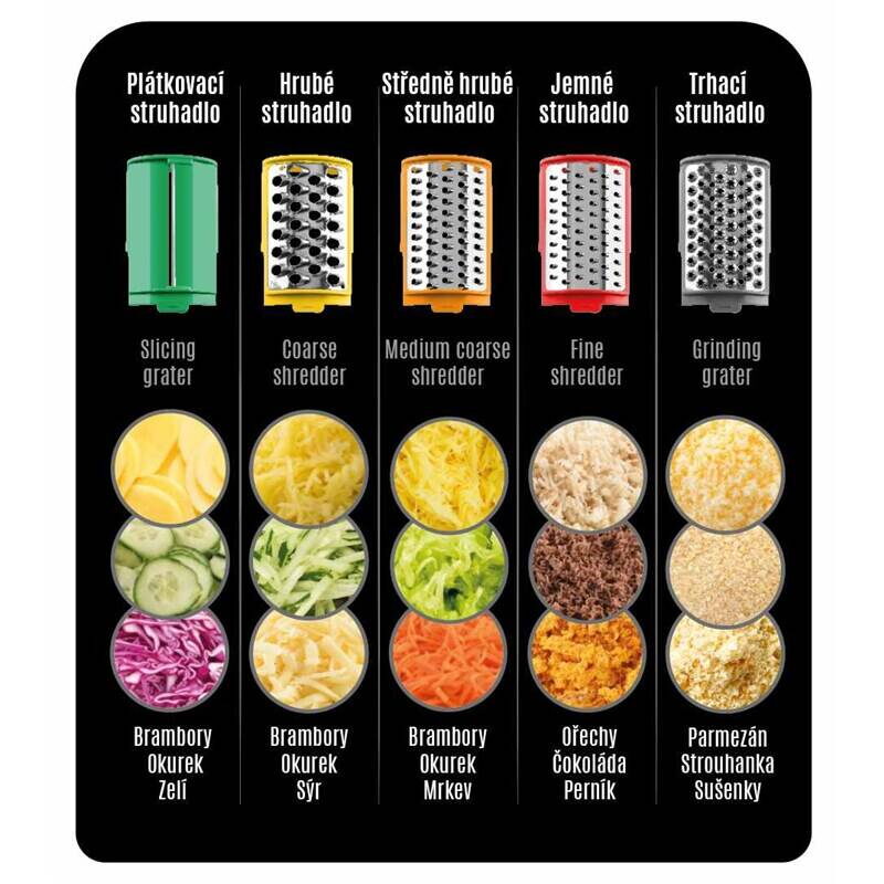 Vybírejte až z 5 strouhacích nástavců se kterými se můžete pustit do zpracování téměř všech surovin. K dispozici pro vás bude plátkovací, hrubé, středně hrubé, jemné a trhací struhadlo. Nástavce můžete i zkombinovat. Použijte jedno jemné a jedno hrubé struhadlo například na bramboráky. ETA Grata pro vás najednou vytvoří ideální směs na jejich přípravu.