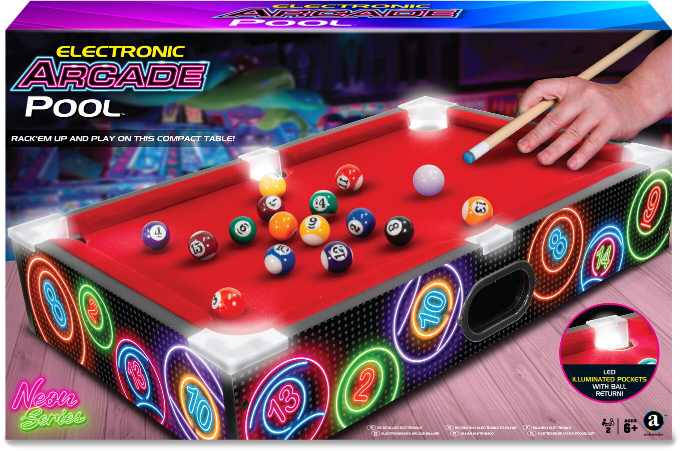 Stolní kulečník o délce 51 cm (20") vnese do vašeho domova nebo kanceláře klasickou hru pool v kompaktní a interaktivní podobě. Díky malým rozměrům se snadno umístí kamkoliv a zabaví hráče všech věkových kategorií. Osvětlené rohové kapsy – barevné LED světlo zvýrazní každý vstřelený bod a umocní atmosféru hry. Automatický návrat koulí – systém se postará o plynulou hru bez nutnosti sbírat koule ručně. Profesionální kulečníkové koule – vyrobené z odolného materiálu, přesně jako na plnohodnotném stole, pro autentický zážitek. Obsah balení: 1× dřevěný kulečníkový stůl 16× kulečníkové koule 2× tága 1× trojúhelníkový rám Návod k obsluze