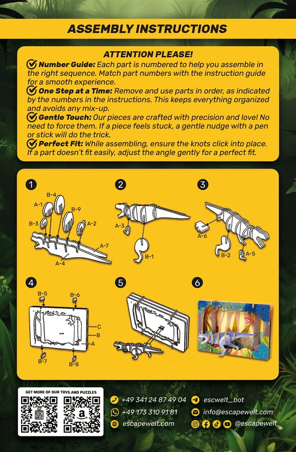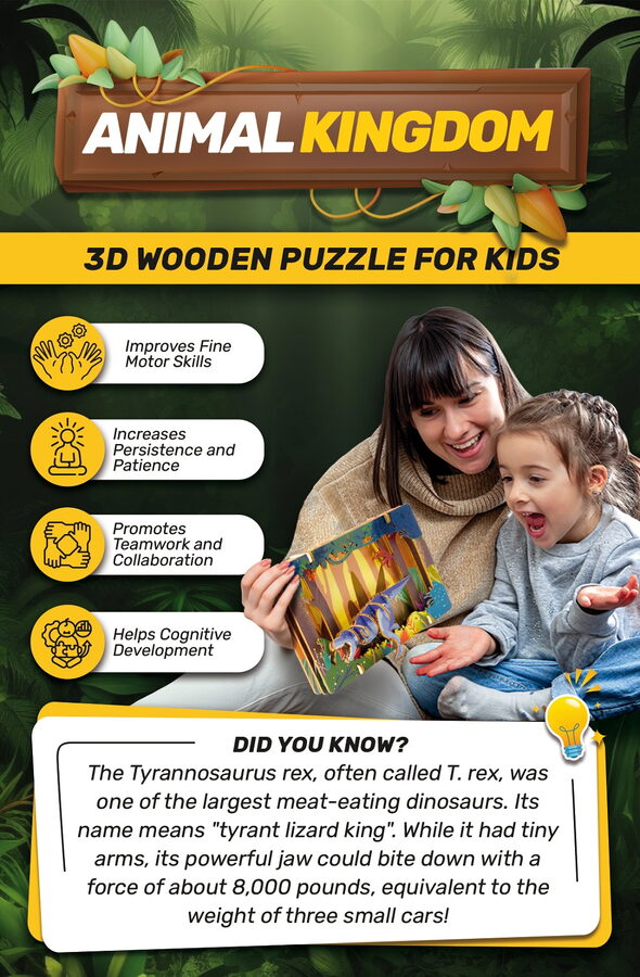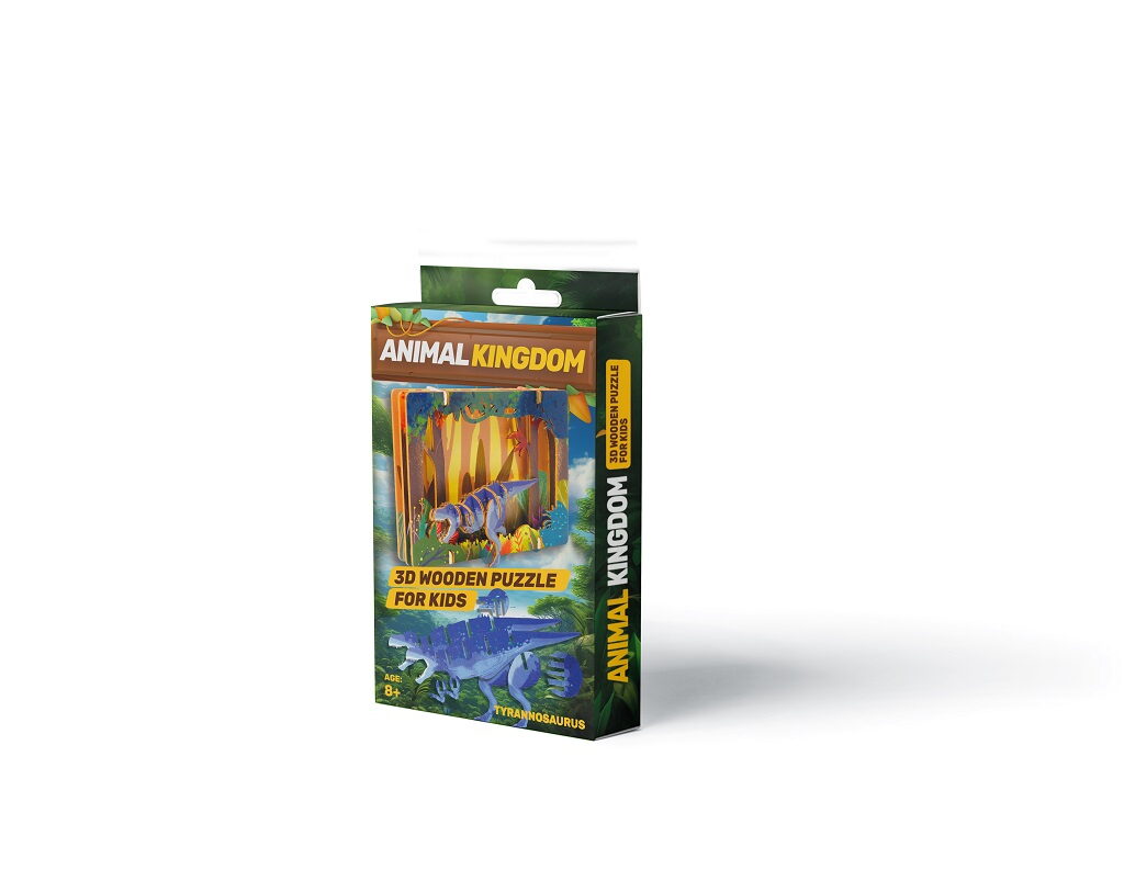 3D puzzle Tyrannosaurus je pro děti zábavné a zároveň výzvou pro rozvoj jejich prostorové představivosti a logického myšlení. Rozvíjí se zároveň také jemná motorika. Toto dřevěné 3D puzzle obsahuje dílky, které musí být správně složeny dohromady, aby vytvořily podobu oblíbeného Tyrannosauruse. Jednotlivé díly z dřevěné překližky jednoduše vymáčknete a dle přiloženého návodu krok za krokem skládáte různé modely - dřevěné hračky. Puzzle nemusíte lepit lepidlem, pak je lze kdykoliv rozložit a znovu složit. Doporučujeme si proto ponechat návod ke stavbě. Barevné dřevěné 3D puzzle jsou opatřeny kvalitním potiskem. Tyto dřevěné hračky jsou určeny dětem od 8 let a splňují všechny normy EU. Upozornění: Není vhodné pro děti do 3 let, protože obsahuje malé součásti – hrozí nebezpečí udušení. Balicí materiál není hračka. Hlavní vlastnosti: přírodní dřevěné 3D puzzlerozvíjí jemnou motoriku a představivostvhodné od 8 letjednoduchá obtížnost