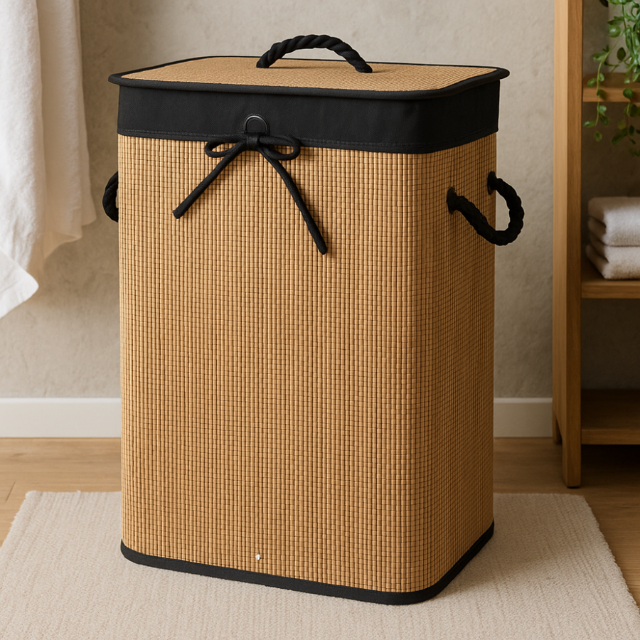 Praktický a elegantní koš na prádlo vyrobený z kvalitního bambusu (Phyllostachys heterocycla), ideální pro moderní i rustikální interiéry.