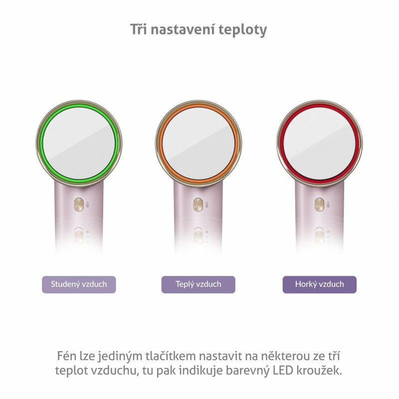 - Nastavení teplot: studený vzduch, teplý vzduch (55 °C) pro šetrné vysoušení, horký vzduch (80 °C) pro běžné vysoušení