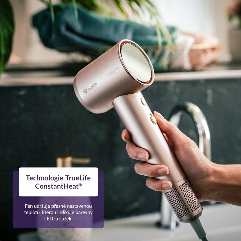 Technologie TrueLife ConstantHeat® spolehlivě udržuje konstantní teplotu po celou dobu sušení. Vlasy se tak zbytečně nepoškozují, jsou hebké a lesklé. Vybrat si můžete ze 3 teplotních stupňů. Aktuální nastavení teploty indikuje barevný LED kroužek okolo zrcadlové plochy. Zelená barva signalizuje studený vzduch, teplý vzduch barva oranžová a a střídavý žlutá.