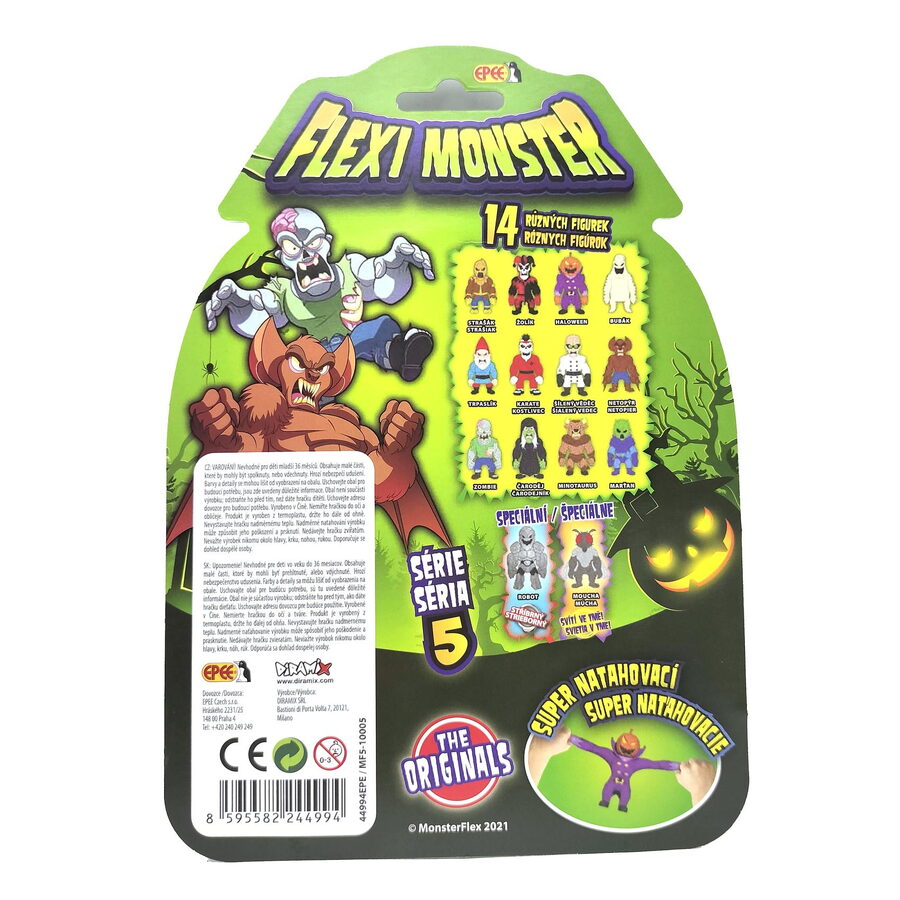Flexi Monster série 5 je tady! Na výběr máte ze 14ti různých strašidelných figurek. Natahujte je, roztahujte je, mačkejte je, proplétejte jim končetiny. Jsou odporní, jsou strašidelní, ale rozhodně vás nebudou nudit. Uvidíte, s těmito měkkými příšerkami si užijete spoustu zábavy. Pozor! Kolekce obsahuje dvě speciální figurky (stříbrného Robota a ve tmě svítící Mouchu), Assort.: 14. Pro děti od 3 let.