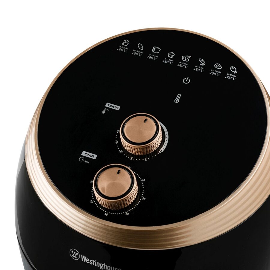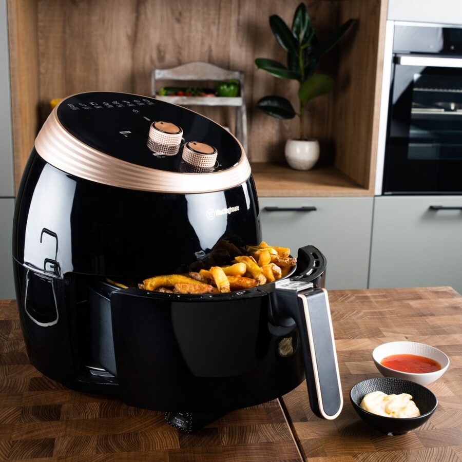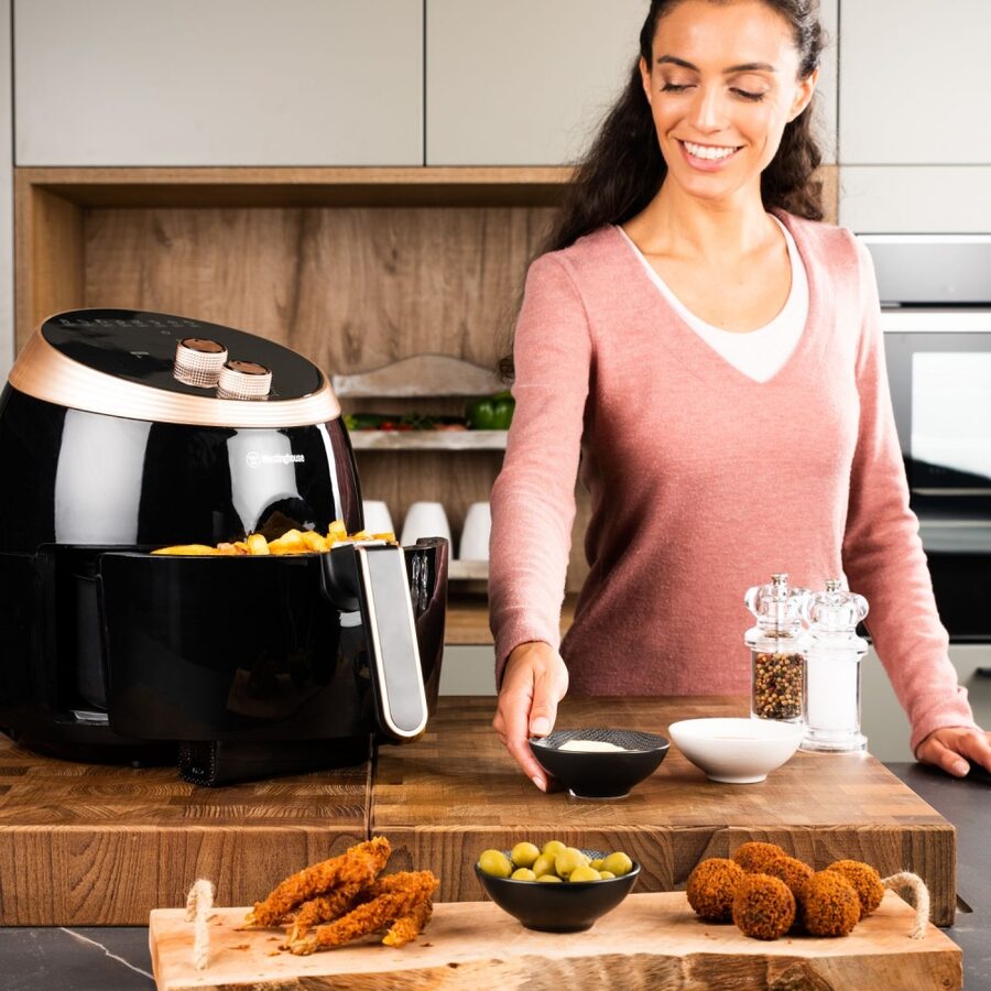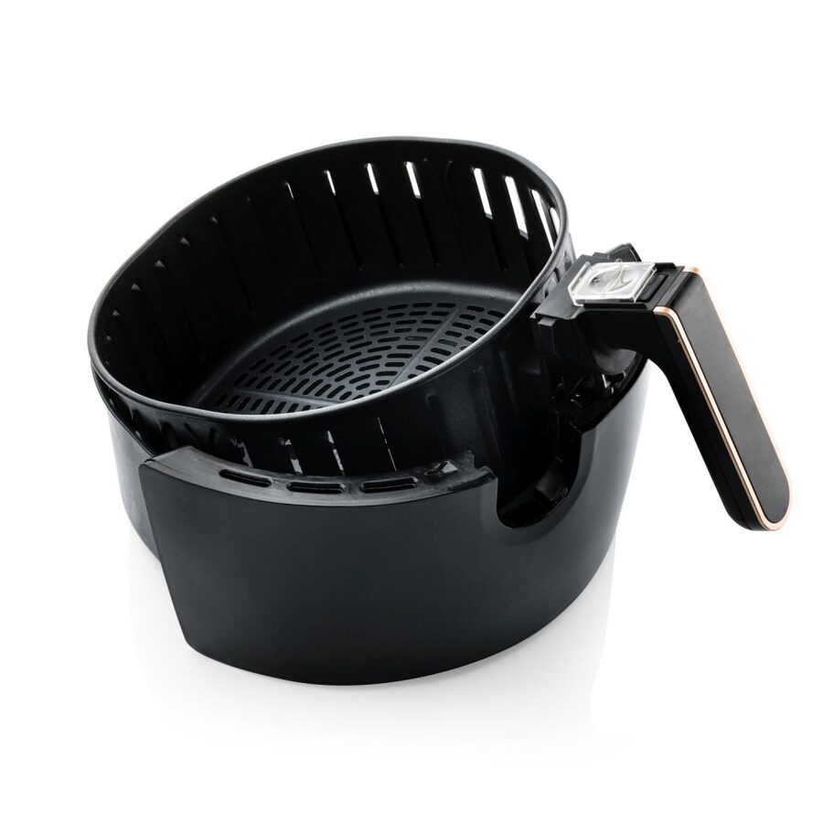 Objem 5 l, Regulace teploty až do 200 ° C, 60minutový časovač pro automatické vypnutí, Nepřilnavý potahovaný výsuvný díl, Pečící koš vhodný do myčky.