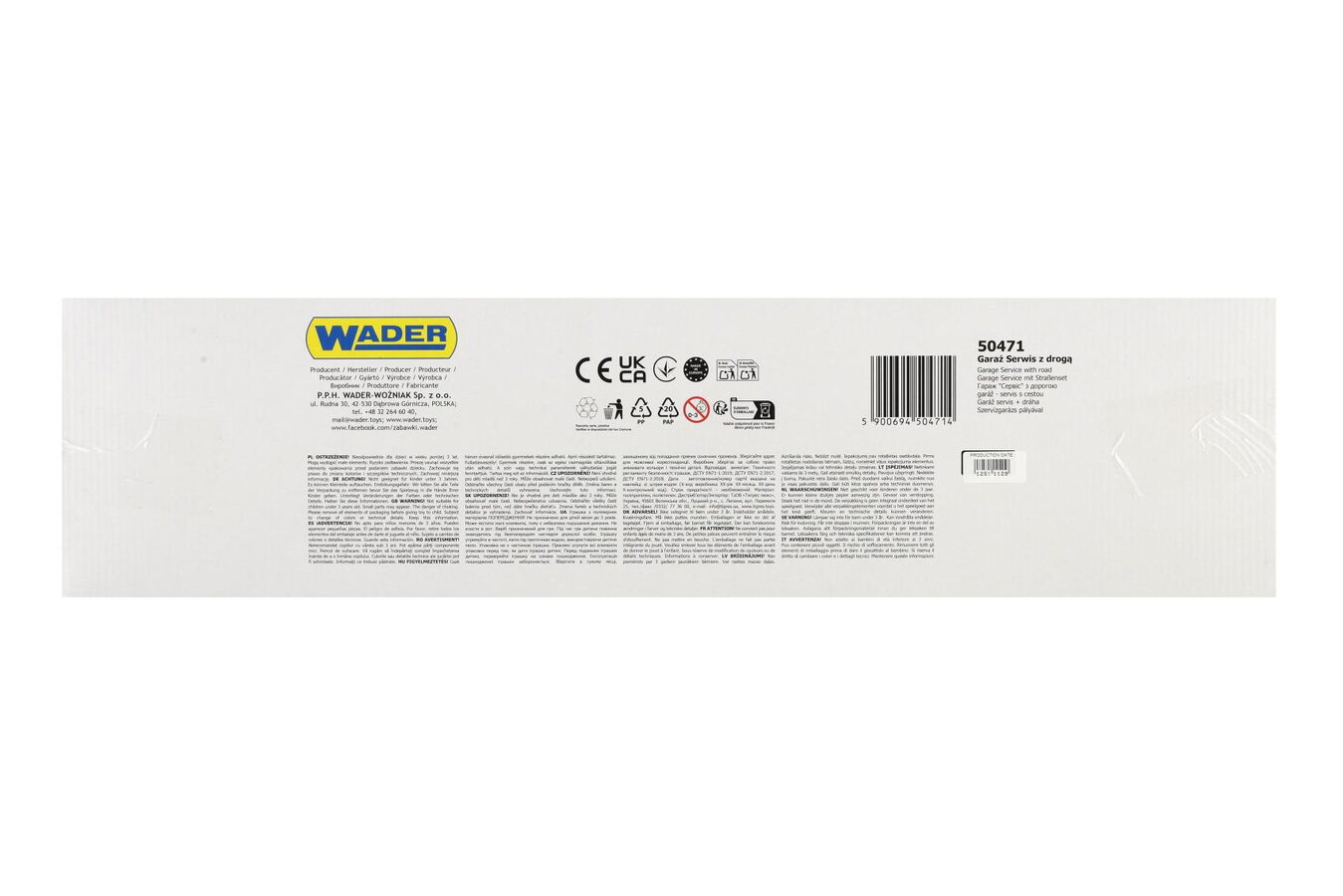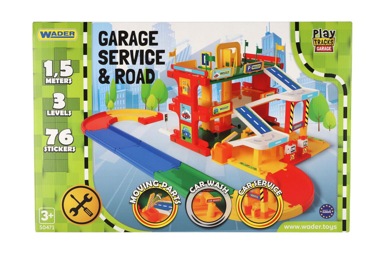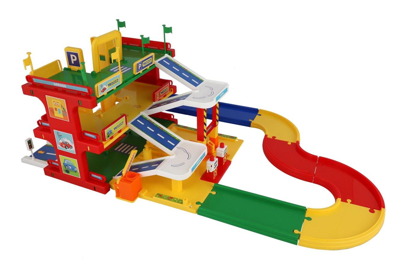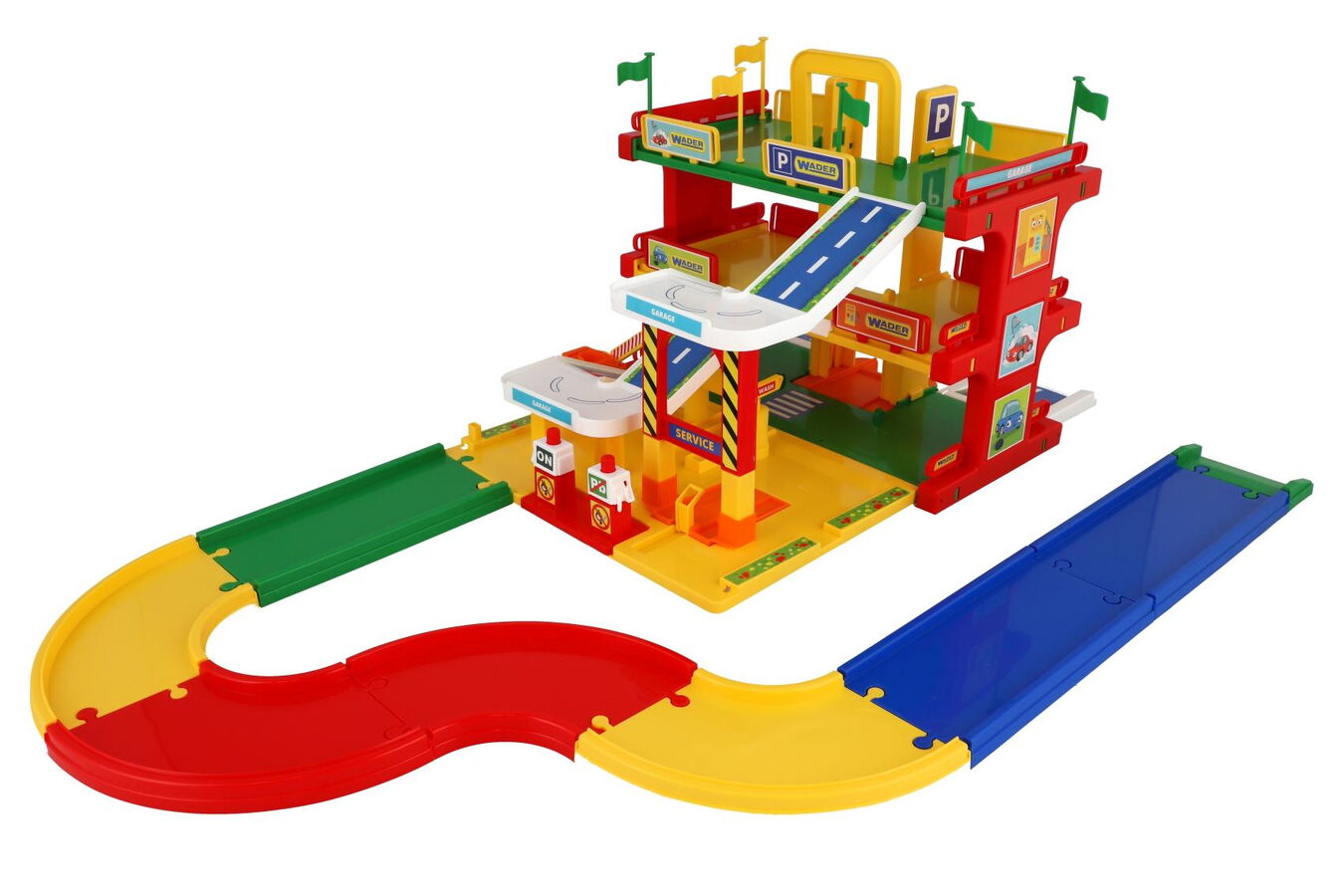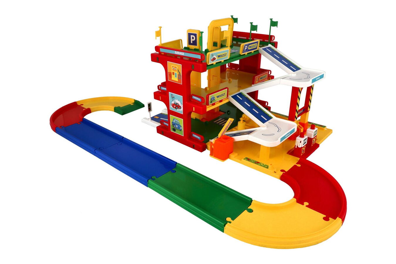 Garáž servis 3 patra + dráha 1,5m + 2 auta plast v krabici 59x40x15cm Wader