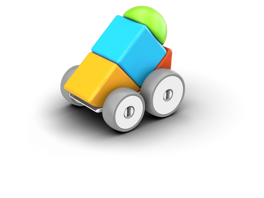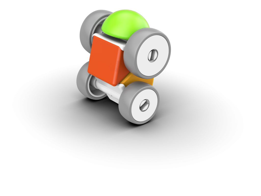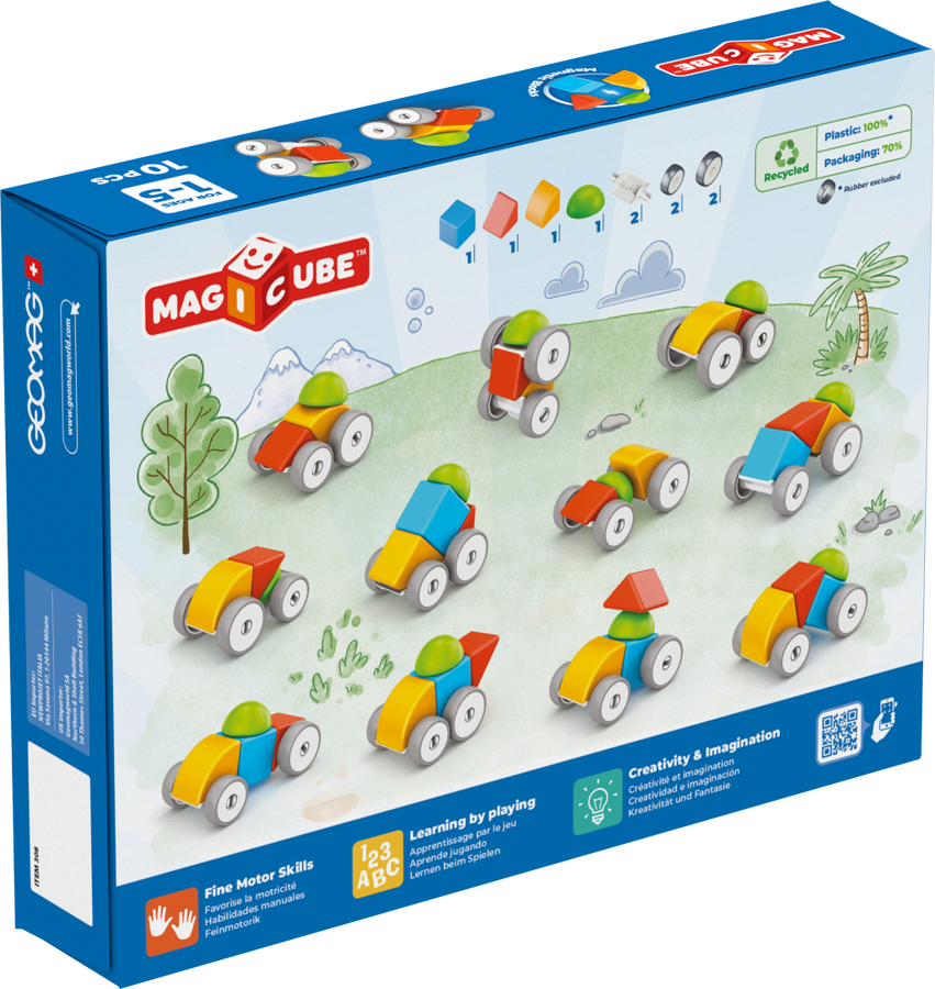 Magnetická stavebnice Geomag Magicube obsahuje 4 magnetické prvky různých tvarů a barev a 4 kolečka se dvěma podvozky. Ideální i pro malé děti již od 1 roku. Vyrobeno ve Švýcarsku, z recyklovaného plastu.