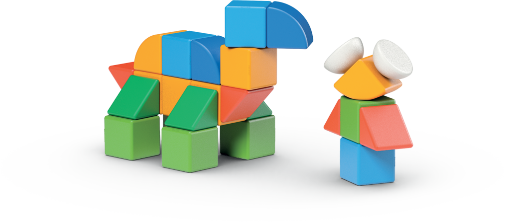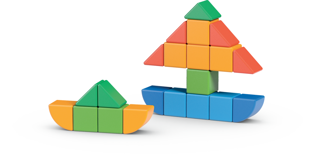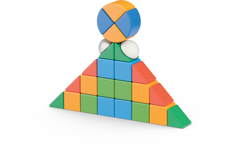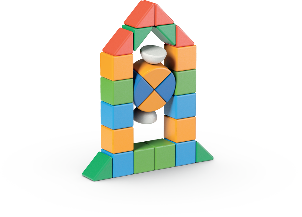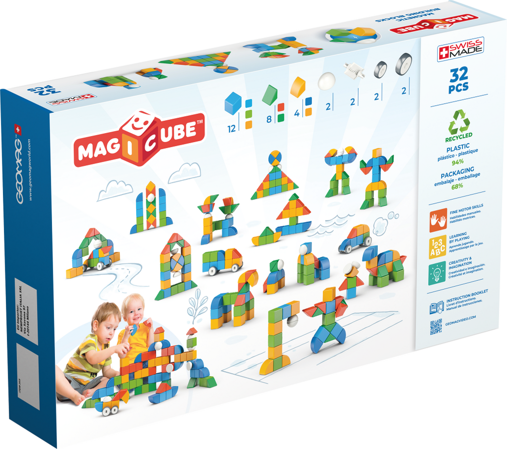 Kromě magnetických krychliček jsou součástí této sady také další tři magnetické tvary a čtyři kolečka. Obsahuje celkem 32 dílků. Vyrobeno ve Švýcarsku za použití recyklovaných plastů. Vhodné od 1 roku.