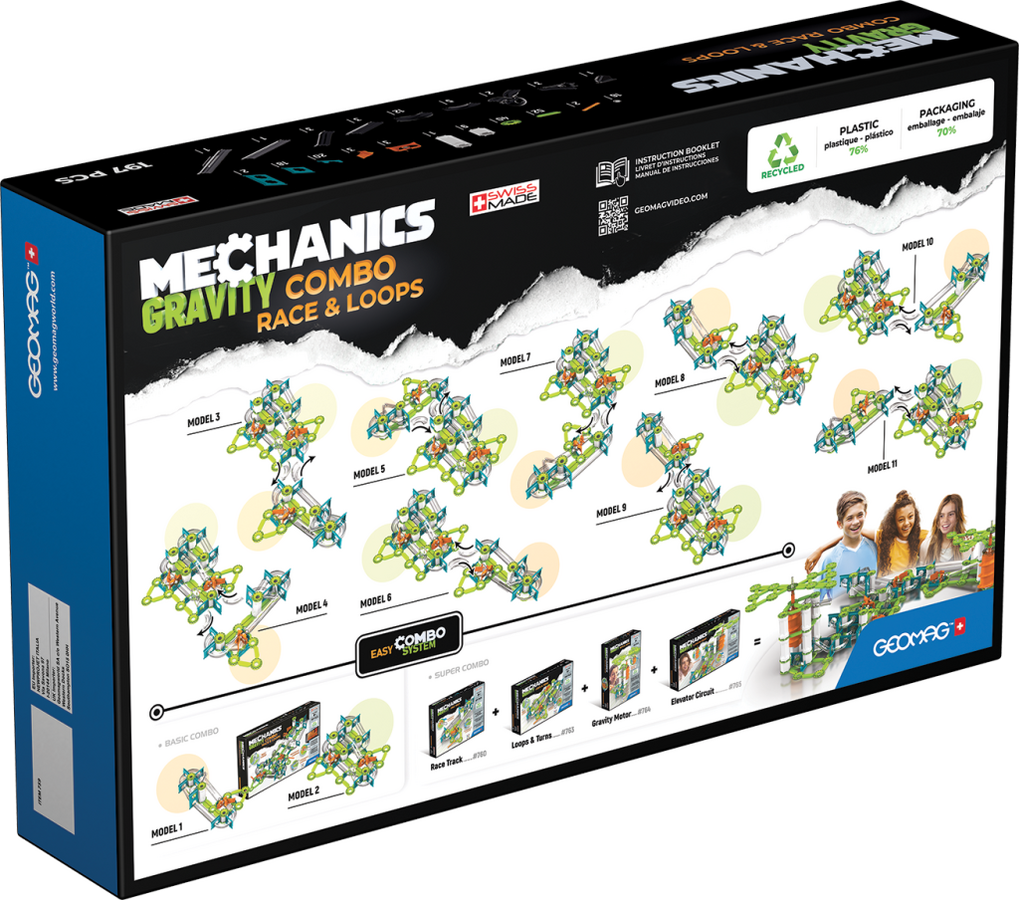 Se stavebnicí Geomag Mechanics Gravity Combo vytvoříte jedenáct různých okruhů a tratí. Nechte obíhat ocelové kuličky po vlastnoručně postavené dráze a sledujte, jak fungují fyzikální zákony. Stavebnice obsahuje 197 dílků. Všechny barevné části stavebnice jsou z recyklovaného plastu. Vhodné pro každého od 8 let, vyrobeno ve Švýcarsku.