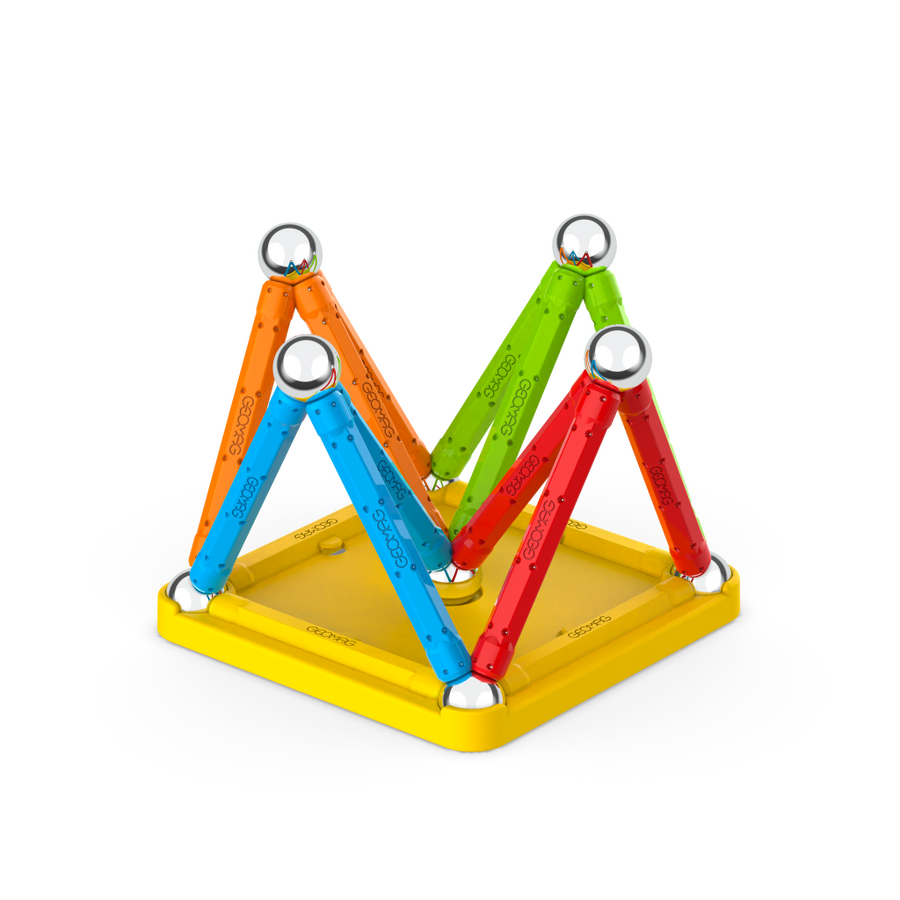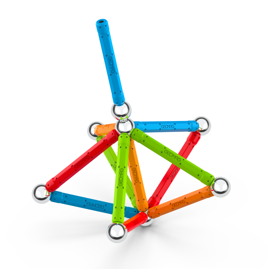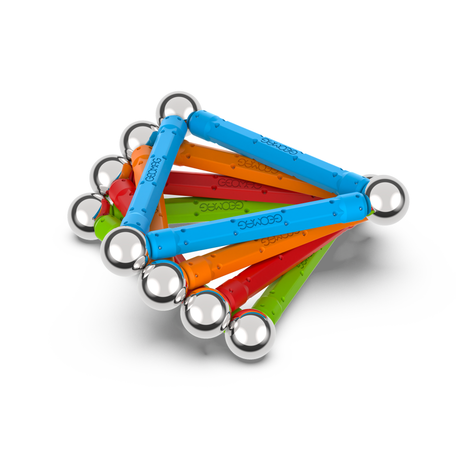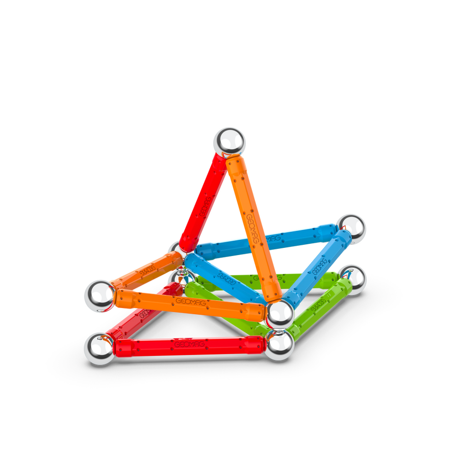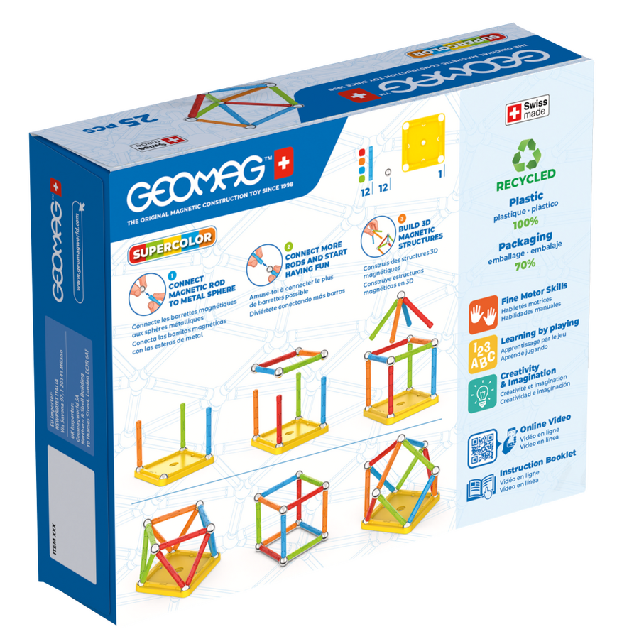 Magnetická stavebnice Geomag Supercolor obsahuje 12 magnetických tyček různých barev, 12 ocelových kuliček a 1 čtvercový podstavec, celkem 25 dílků. Všechny plasty použité pro potahy tyček a podstavců jsou ze 100% recyklovaného materiálu a jejich dokonalé barvy potěší i ty nejnáročnější. Součástí balení je navíc praktický úložný box – máte tak možnost mít stavebnici pořád u sebe a navíc přehledně srovnanou v kapesním balení. Vyrobeno ve Švýcarsku, z recyklovaného plastu, vhodné od 3 let.