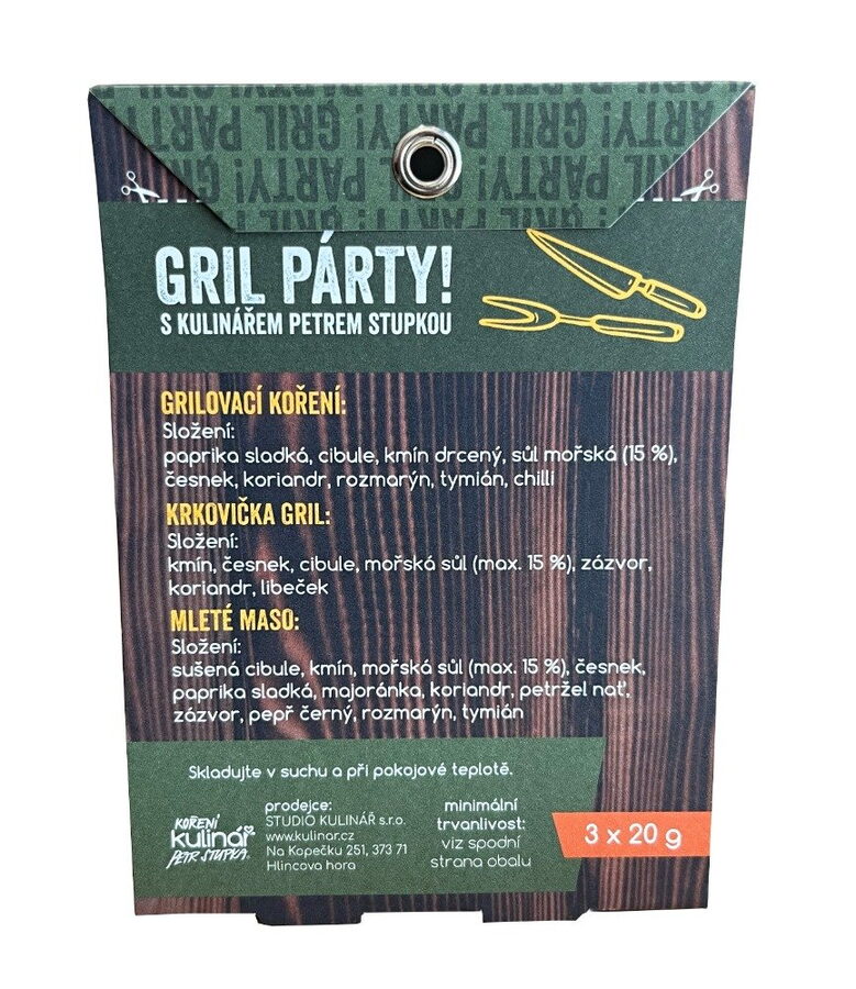 Krkovička gril – kmín, česnek, cibule, mořská sůl (max. 15%), zázvor, koriandr, libeček