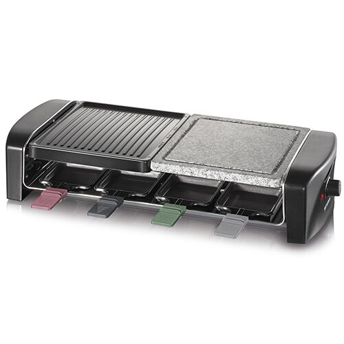 - výbavu grilu obohacuje 8 raclette pánviček s barevnými úchyty, takže vždy budete mít přehled o tom, jaký pokrm ve spodní části pod grilovacími deskami připravujete