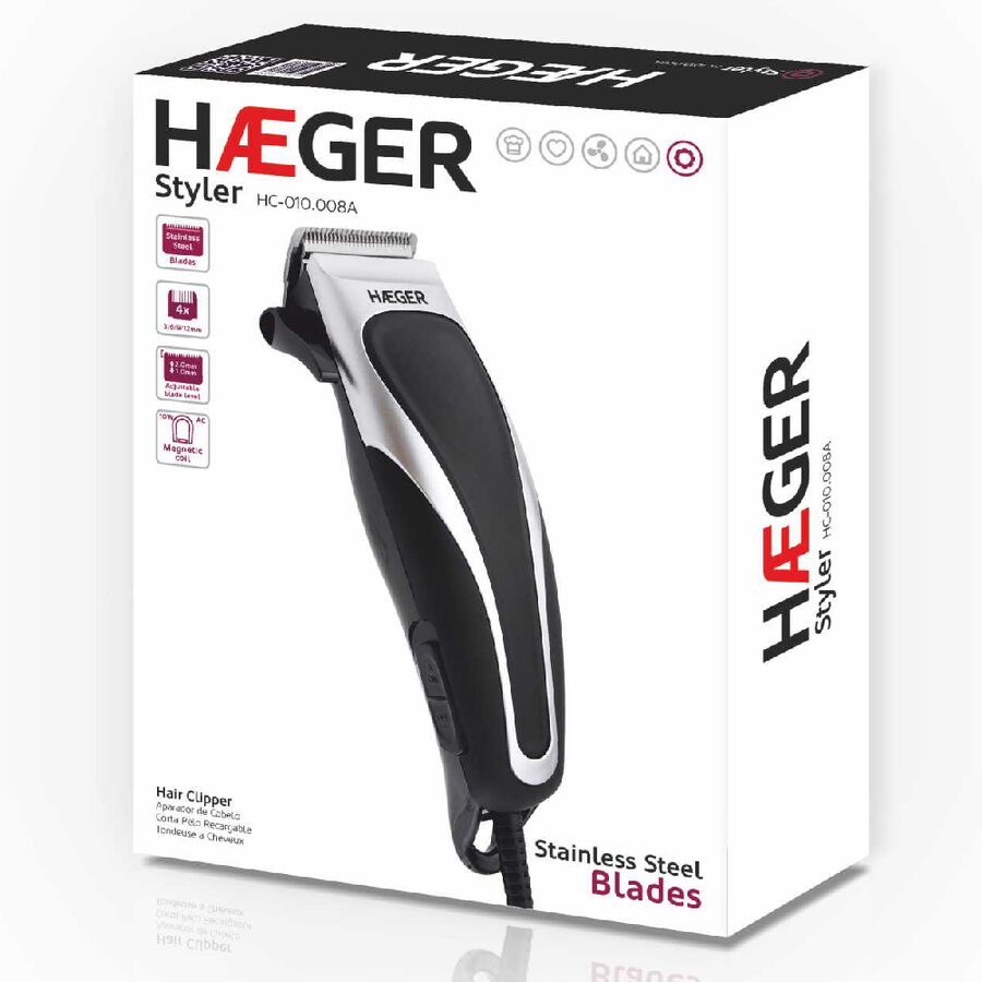 HAEGER zastřihovač vlasů STYLER se dodává s čepelemi z nerezové oceli, je ergonomický a praktický, má nastavitelnou úroveň čepele se 4 hřebeny (3 mm, 6 mm, 9 mm a 12 mm).