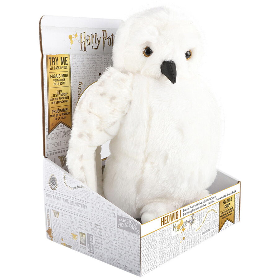 Plyšová Hedvika známá ze série Harry Potter. Sova umí otáčet hlavou pomocí vložené ruky, po stisknutí tlačítka vydává zvuky. Výška postavičky cca. 30 cm.