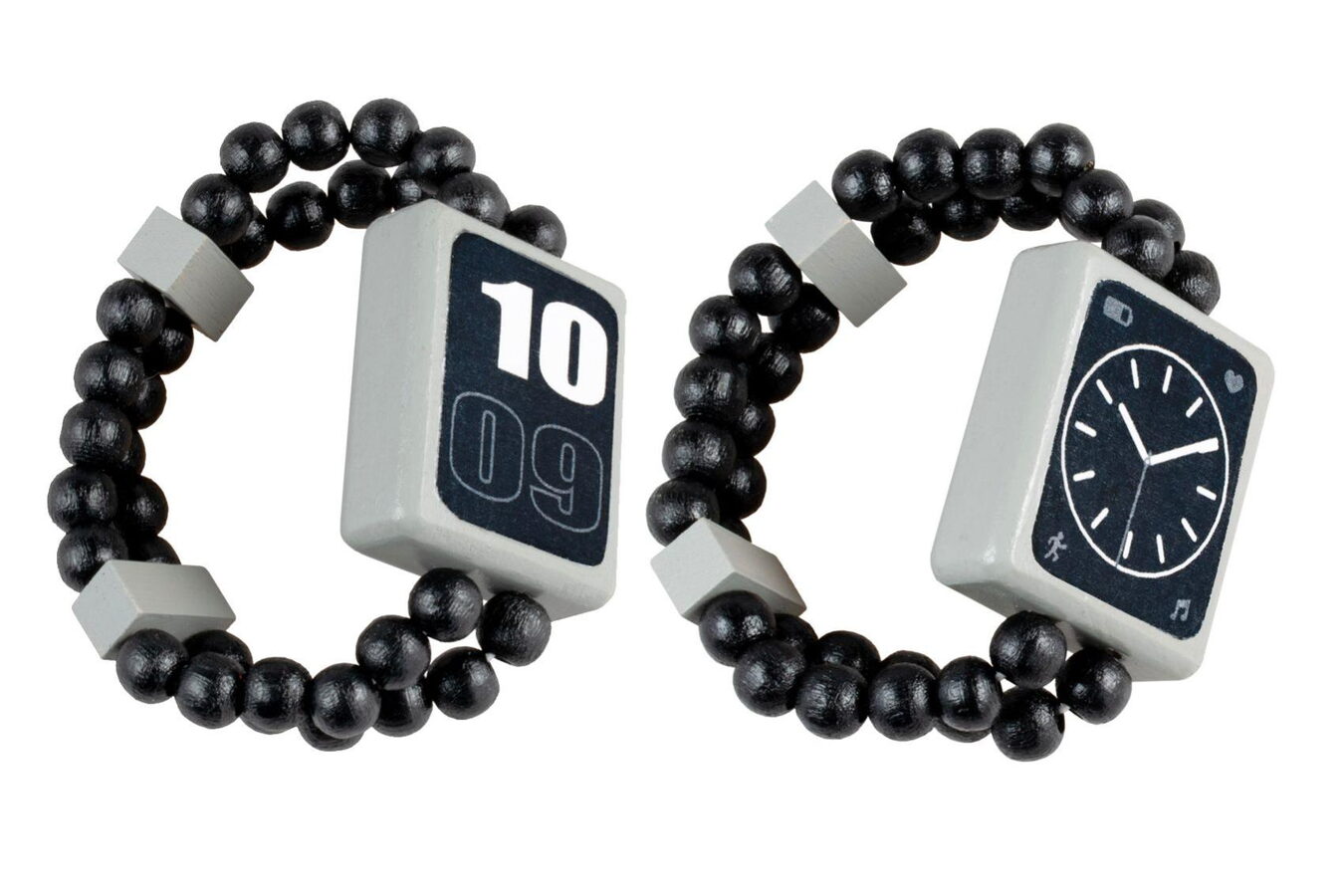 Oboustranné dřevěné hodinky s obrázkem digitálních a ručičkových hodin. Navlečeno na gumičce.