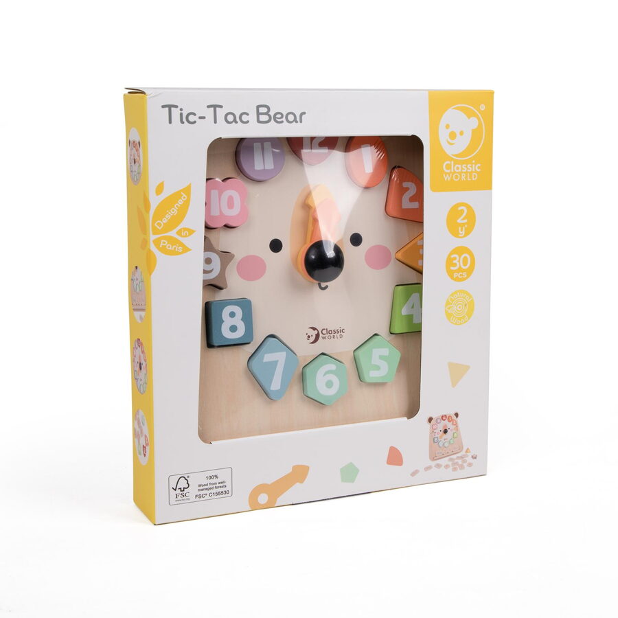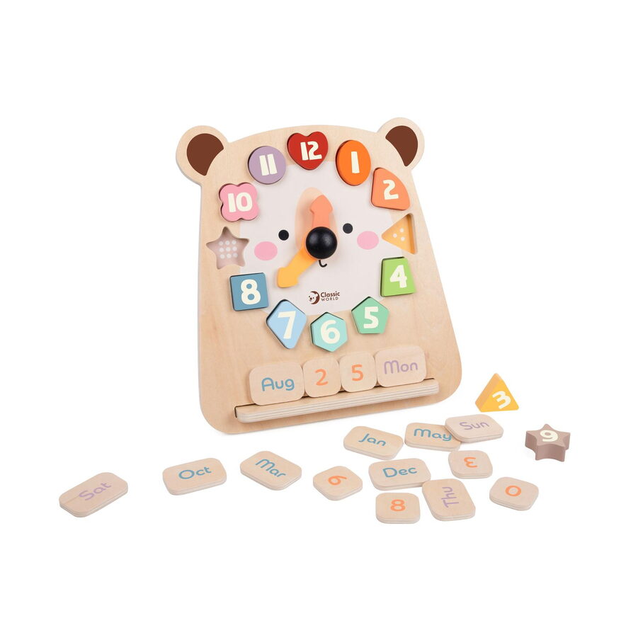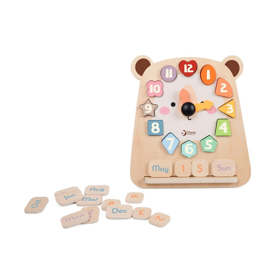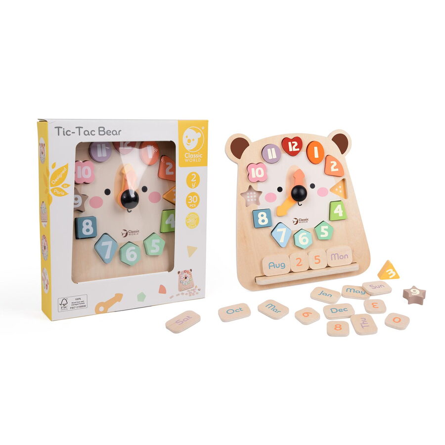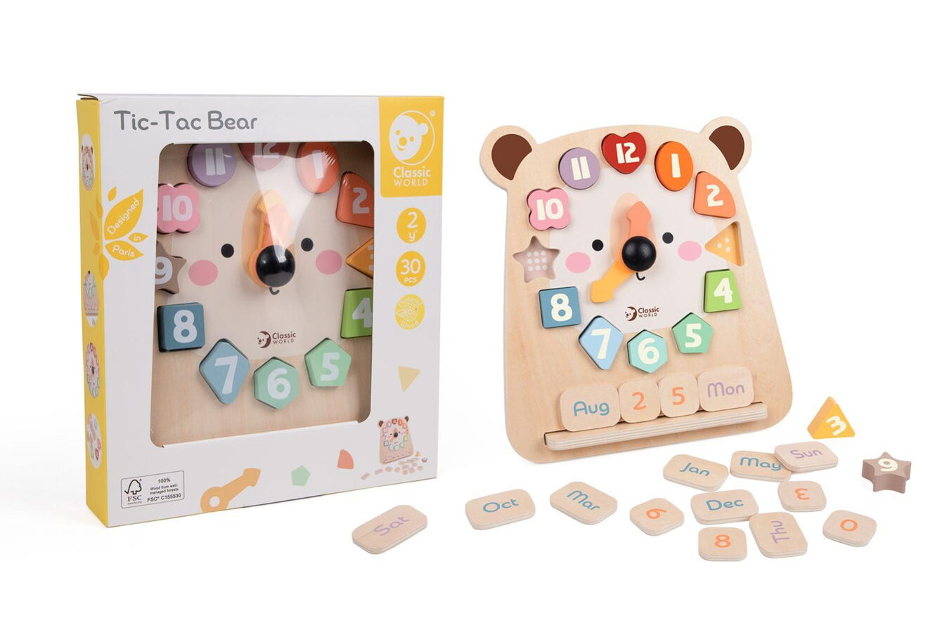 Roztomilé dřevěné hodiny s motivem medvěda pomáhají dětem zábavnou formou naučit se poznávat čas. Barevná vkládačka s čísly rozvíjí jemnou motoriku, logické myšlení i koordinaci ruky a oka. Otáčivé ručičky umožňují jednoduché procvičování hodin, zatímco jednotlivé dílky s čísly lze používat i samostatně při hře nebo počítání. Hračka je vyrobena z kvalitního dřeva a má veselý design, který zaujme každé dítě.
