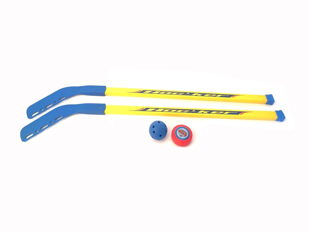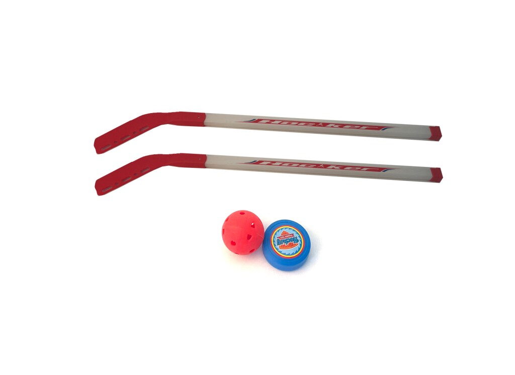 Set obsahuje plastovou hokejku, plastový míček a puk.