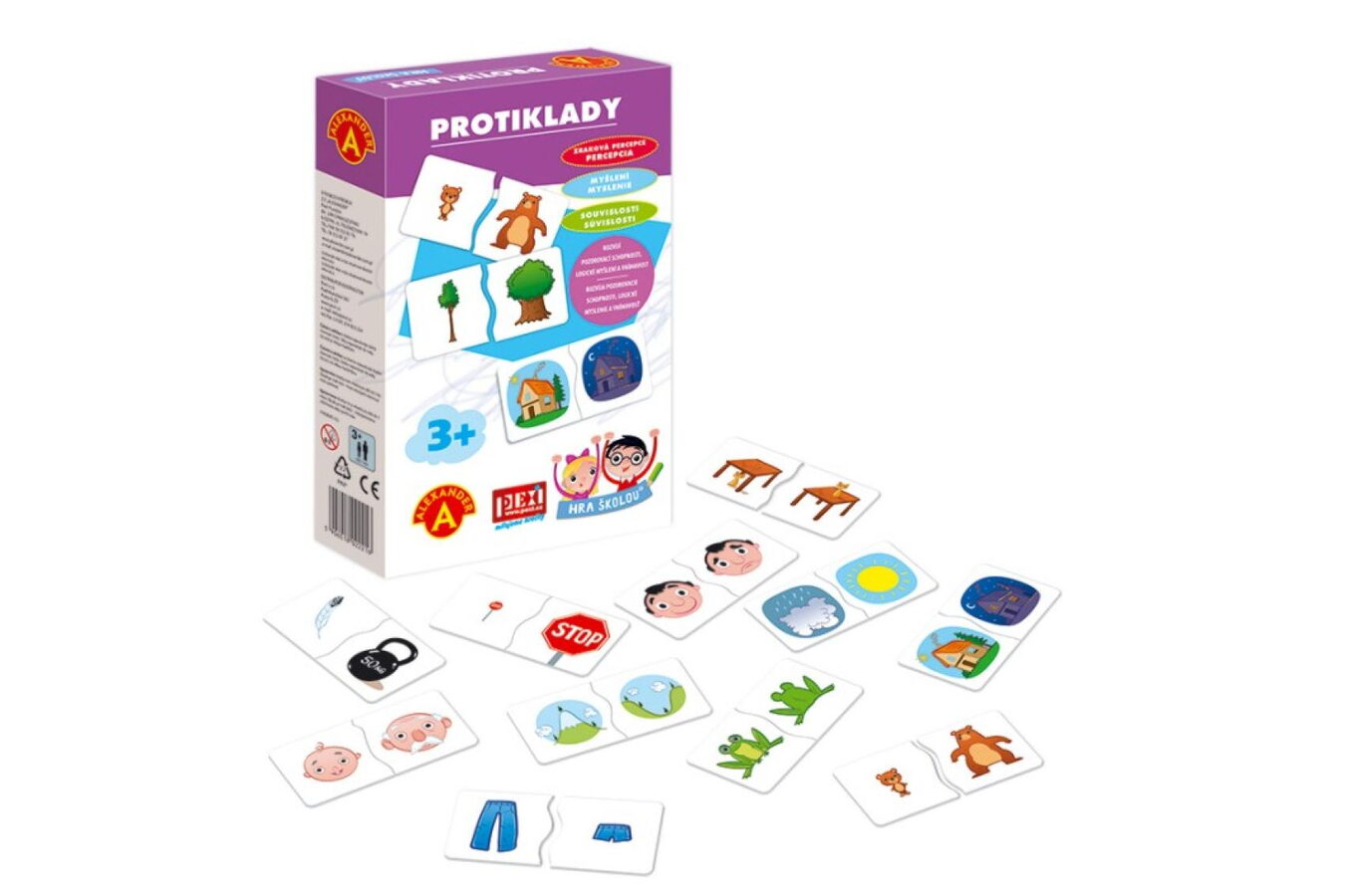 Pomocí dvoudílných velkých kartiček s obrázky se děti učí chápat protiklady (např. malý – velký, den – noc, vysoký - hluboký atd). Skvělá mnemotechnická pomůcka.