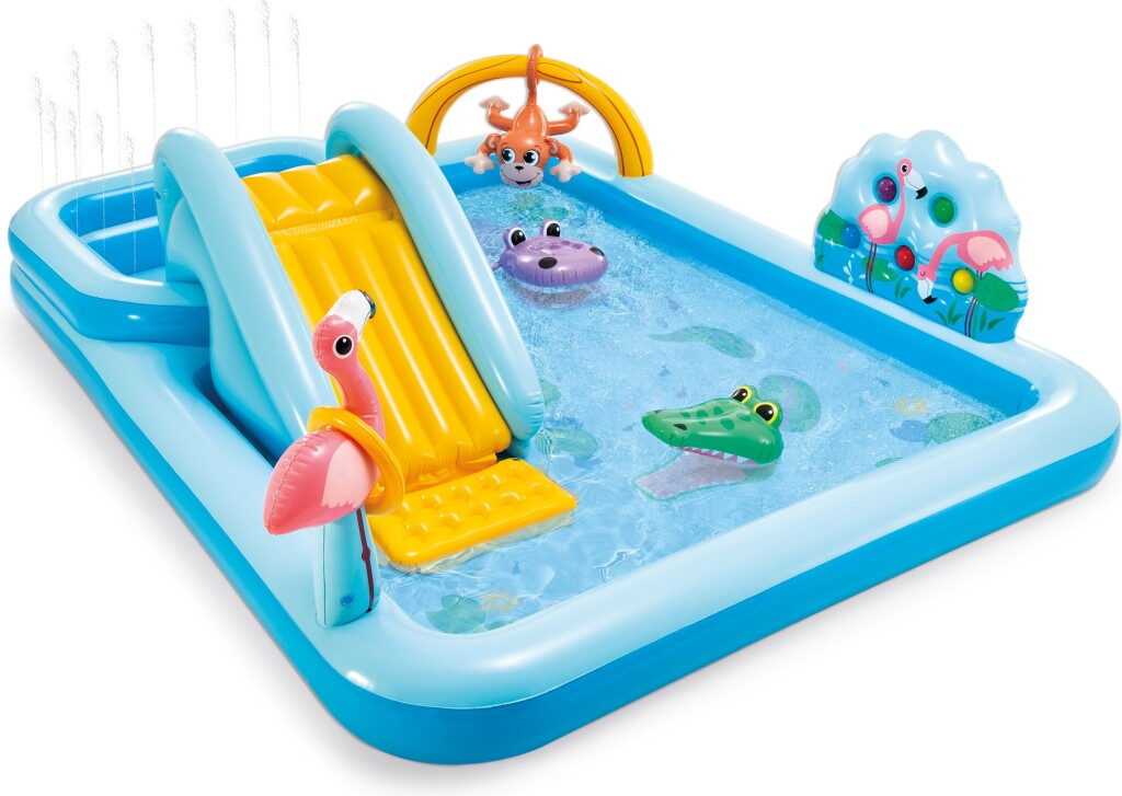 • Přibližná velikost 2,57 m x 2,16 m x 84 cm • Dva bazénky v jednom • Součástí balení vodní skluzavka, nafukovací palma, plameňák, opice, kroužky na hraní a 5 balónků • Nafukovací podlážka • Vypouštěcí ventil • Vodní kapacita – výšky stěny malého bazénku – 11 cm-57 l • Vodní kapacita – výšky stěny většího bazénku – 20 cm-493 l • Možnost zapojení zahradní hadice • Maximální nosnost 81 kg • Opravná záplata součástí balení