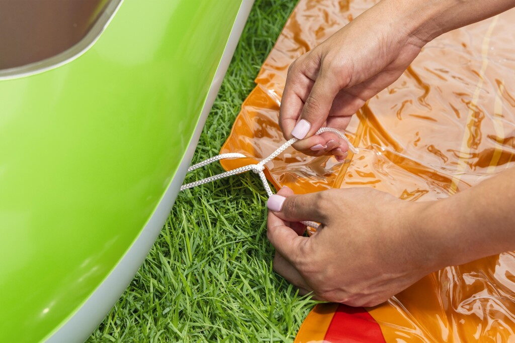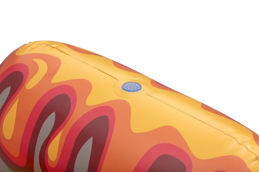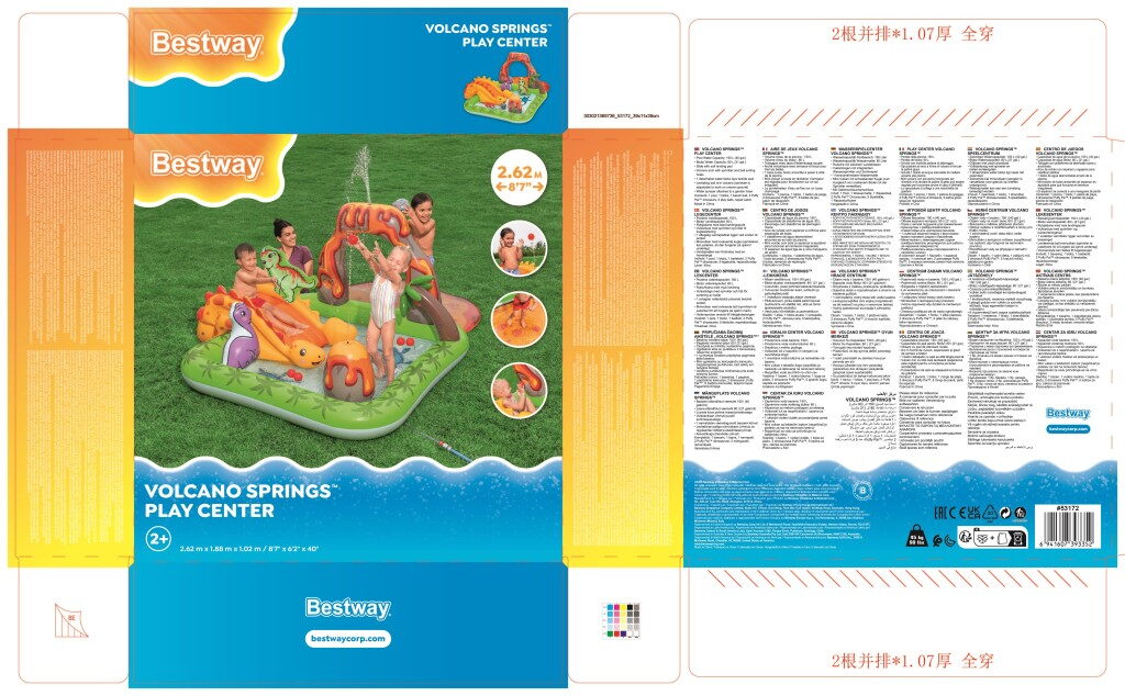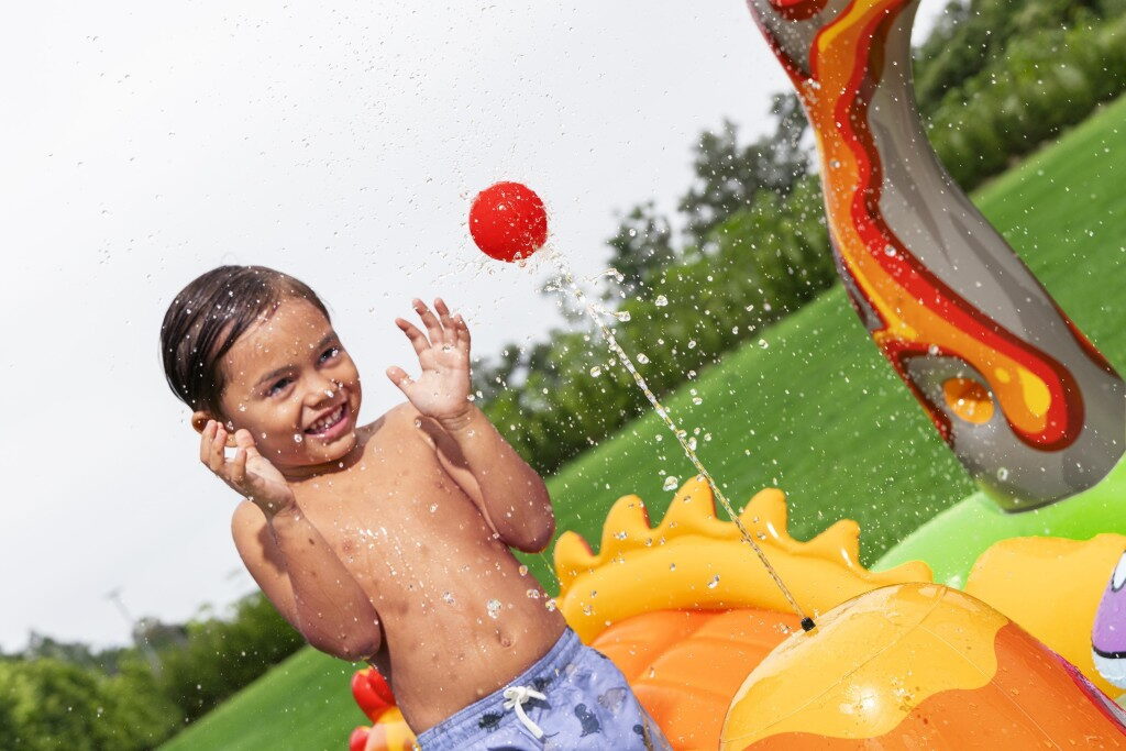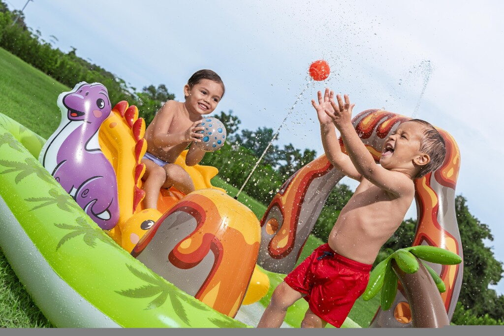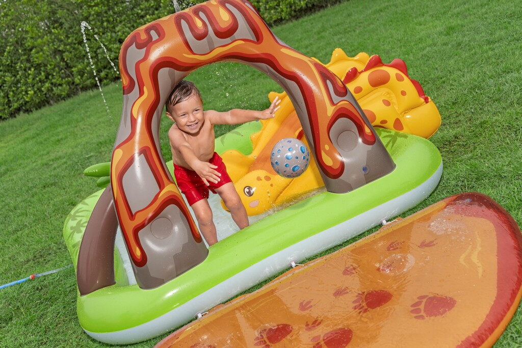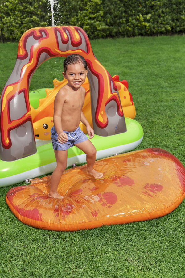 Zábavná skluzavka s měkkou přistávací dráhou. Oblouk vulkánu s rozstřikovačem a otvory na míčky. Mini vulkán s levitujícím míčkem. Rozstřikovač vody se připojuje k zahradní hadici. Obsah: 1 bazén, 1 vodní deka, 1 plážový míč, 2 dinosauři 5 hracích míčků, záplata pro opravy.