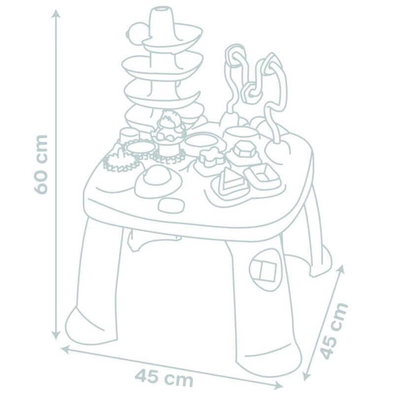 Hrací stůl Little Smoby Activity promění každou dětskou místnost v zábavné herní centrum. Pomáhá dětem objevovat svět prostřednictvím barev, tvarů a pohybu. Děti si procvičí rozpoznávání tvarů díky zasouvacím kostkám a užijí si zábavu s kuličkovou rampou. Hračka nevyžaduje baterie a je ideální pro první smyslové vjemy a koordinaci pohybů.