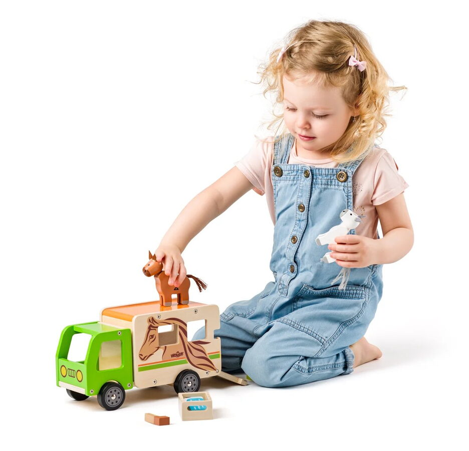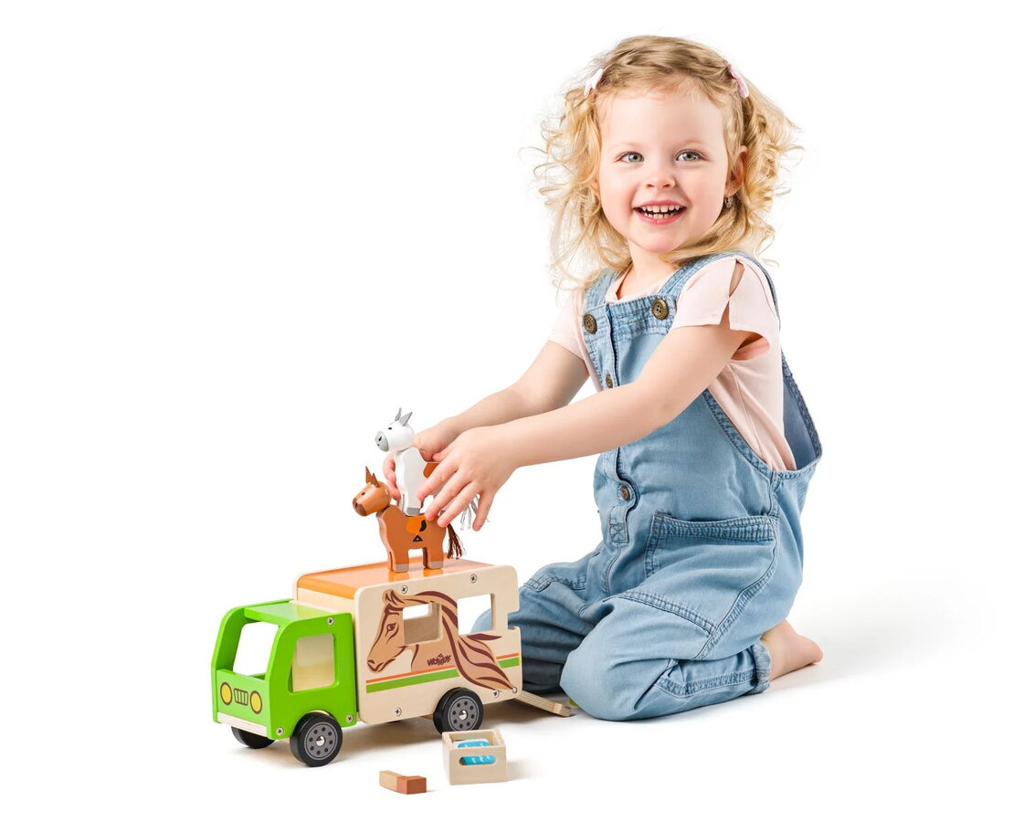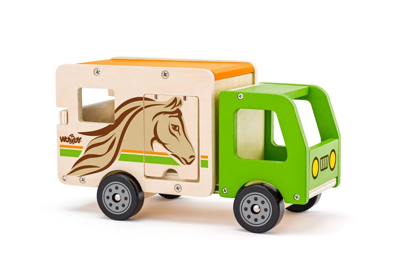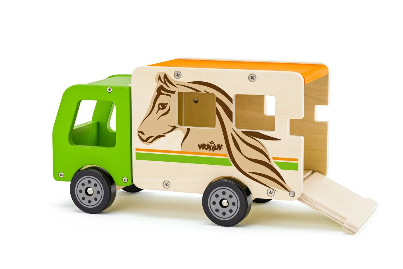 Kamion pro přepravu koní Woody jistě nadchne každé malé dítě. Zadní díl auta totiž může vyklopit. Vytvoří tím plošinu pro koníky, kteří mohou vyjít ven z vozu nebo naopak vejít dovnitř. Kromě plošinky je kamion vybavený také bočními dveřmi pro ošetřovatele.