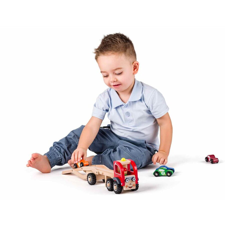 Praktický tahač s návěsem pro malé řidiče od značky Woody. Tahač, návěs i auta jsou vyrobeny z tvrdého masivního dřeva. Patrová plošina pro auta se dá sklopit tak, aby auta mohla najet a zase sjet z rampy. Tahač a návěs se dají odpojit.