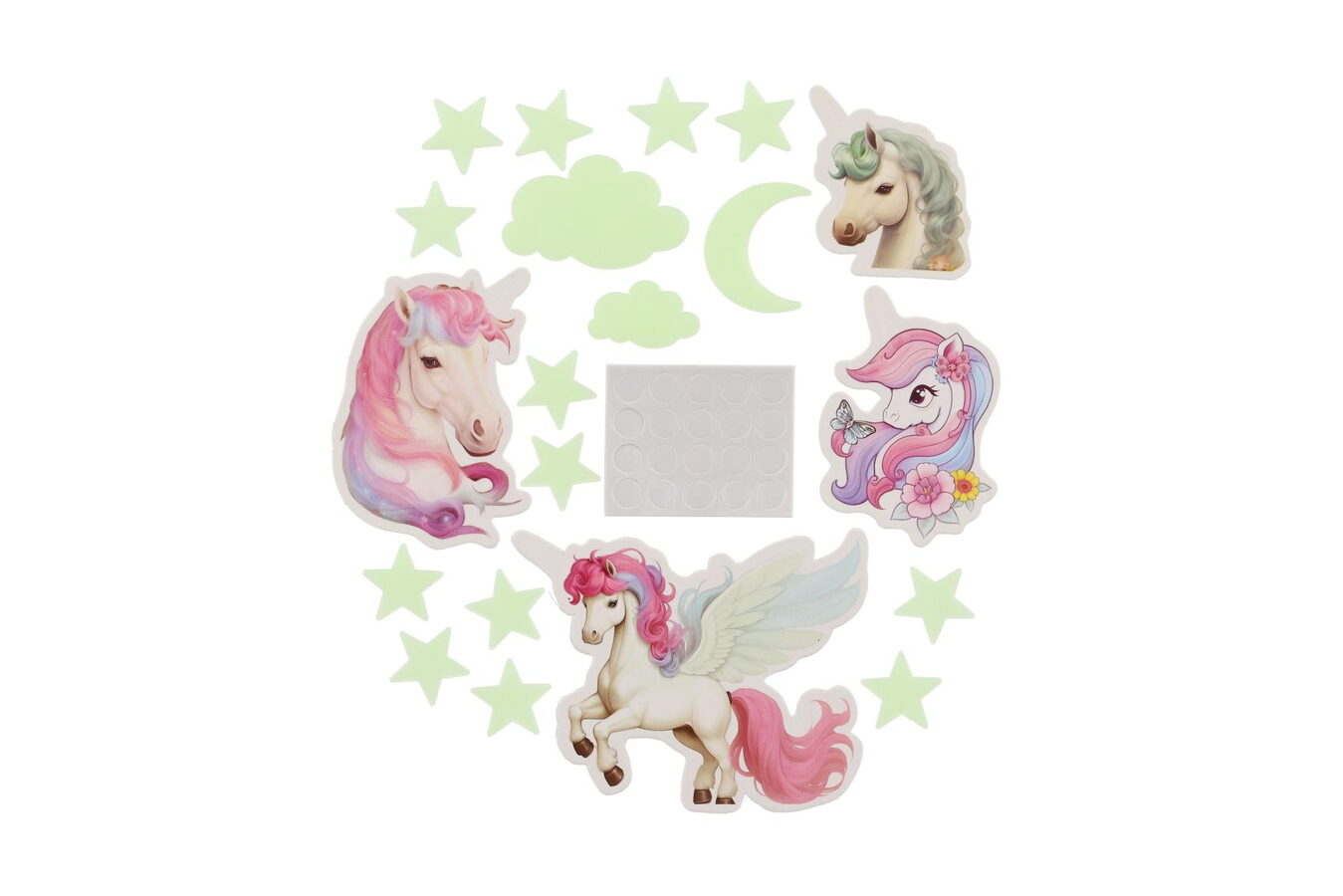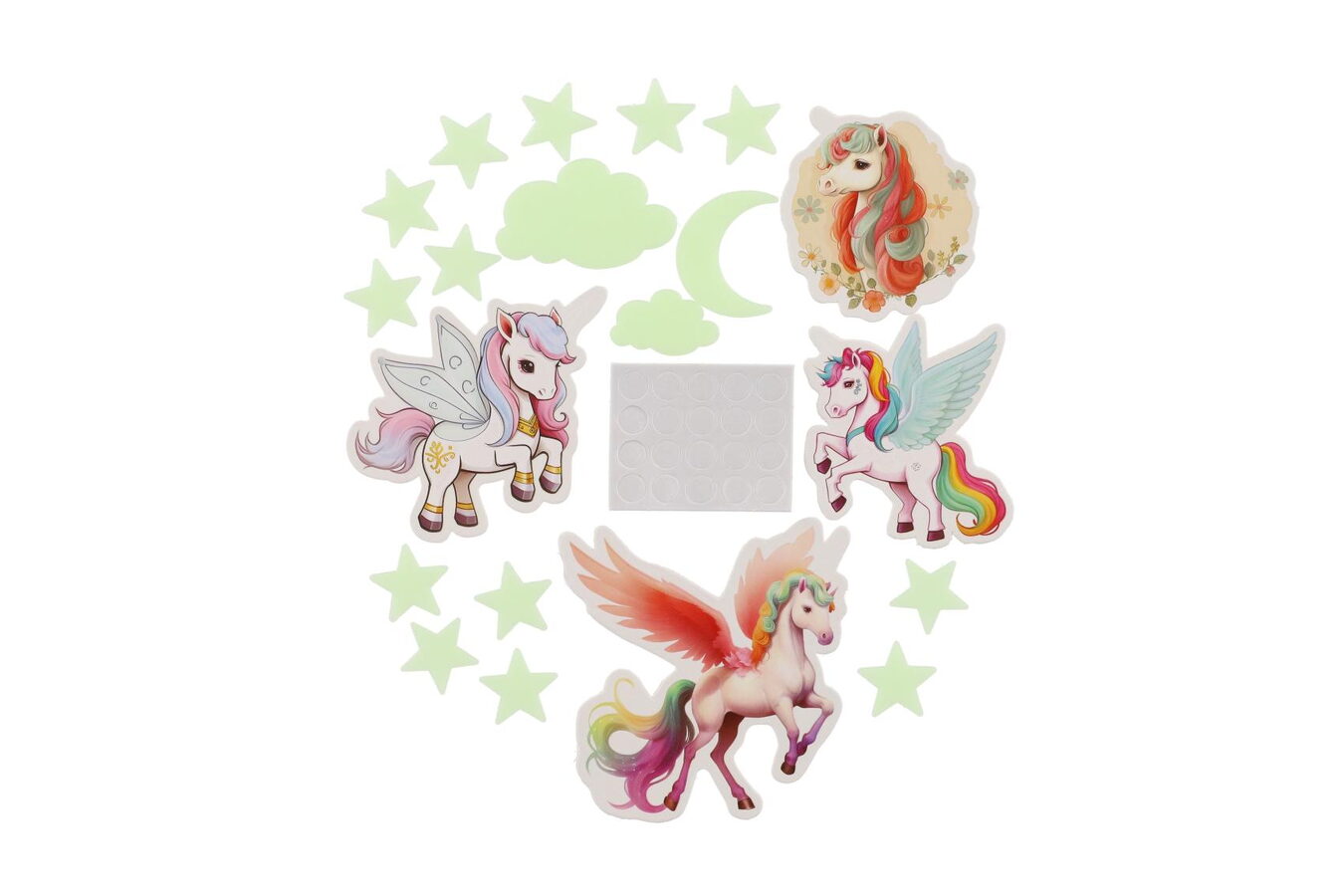 Sada obsahuje roztomilé jednorožce, kteří po nasvícení ve tmě rozjasní dětský pokoj a vytvoří tak okouzlující atmosféru plnou magie. Svítící jednorožci přinesou do dětského pokoje kouzelný nádech, který pomůže dětem usnout a vytvoří klidné a magické prostředí pro spaní.