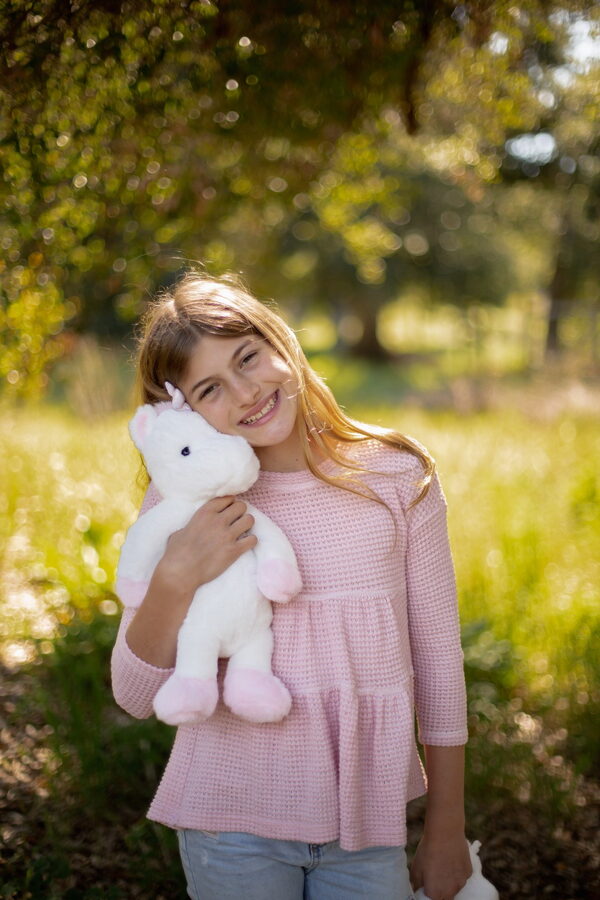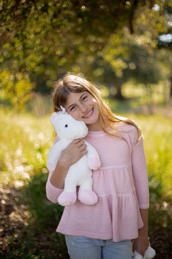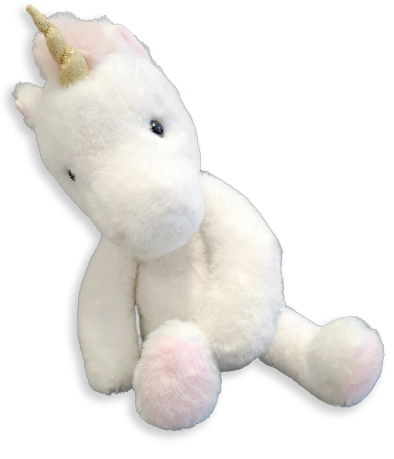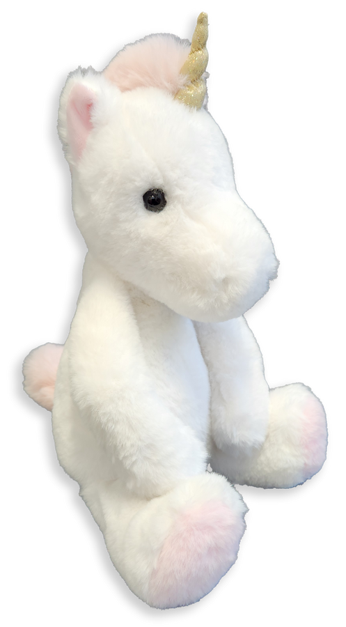 Kouzelný bílý plyšový jednorožec o velikosti 40 cm potěší všechny malé snílky a milovníky pohádkových bytostí. Je vyroben z jemného a hebkého materiálu, ideálního na mazlení. Jeho roztomilý vzhled doplňuje třpytivý roh, které mu dodávají magický šmrnc. Skvělý jako dárek nebo dekorace do dětského pokoje.