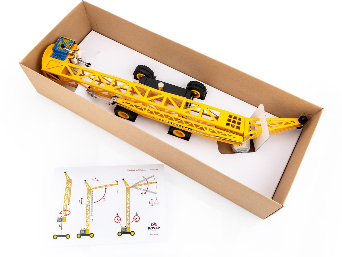 Návod k sestavení: Věž jeřábu s ramenem nasaďte na čep podvozku. Mírným tlakem na věž dojde k nerozebíratelnému spojení. Navlečení provázku je patrné z obrázků na obalu. Při otáčení kličkami je mírně tlačte dovnitř. Aby nedošlo k převržení jeřábu, nezavěšujte břemena těžší 50 g!