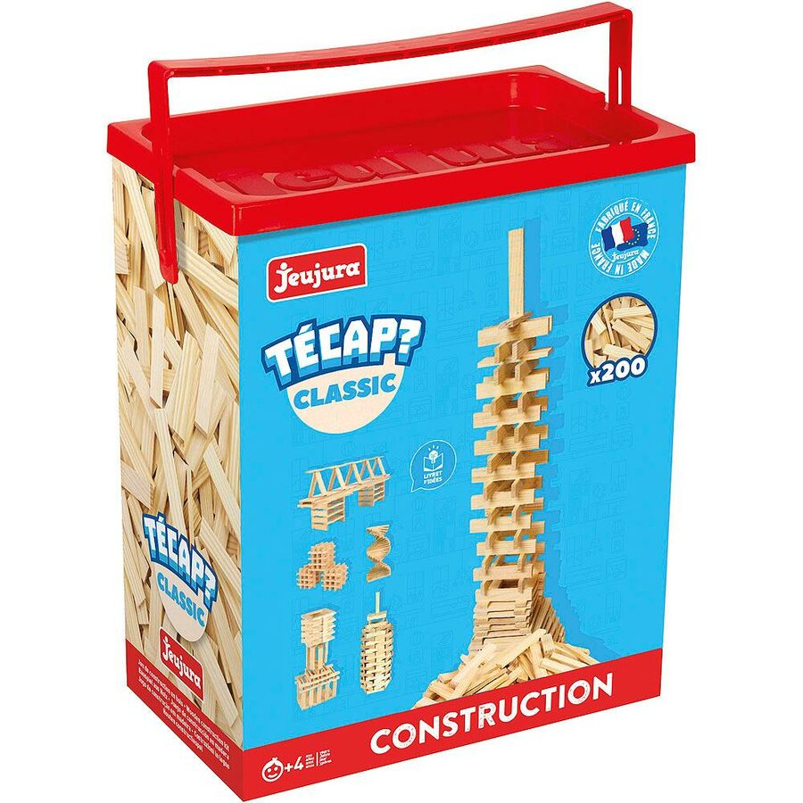 Stavebnice Jeujura Técap? Classic a Color nabízí široký prostor pro realizaci staveb zcela volně dle fantazie dětí. Stavebnice se skládájí z univerzálních dřevěných špalíčků, a to buď v přírodní, nebo barevné úpravě. Stavbou mohou děti rozvíjet vynalézavost a jemnou motoriku. Jsou vyráběny ve Francii, z masivního bukového a borovicového dřeva francouzského původu. Dílky jsou ošetřeny výhradně za použití laků na bázi vody. Každá sada je balena v praktickém lepenkovém kyblíku potištěném rostlinnými inkousty a součástí balení jsou brožury se vzorovými stavbami a jejich detaily. Hlavní vlastnosti:100 přírodních dílků z masivního dřevadílky stejného rozměru, univerzálnípraktické balenívyrobeno ve Francii