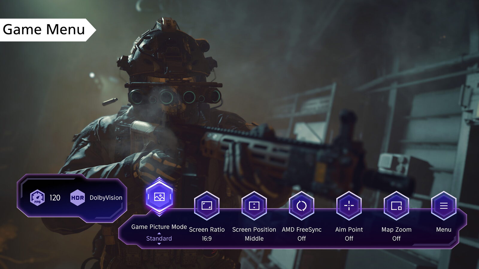 Jakmile připojíte herní zařízení (PlayStation, Xbox či počítač), na televizi se automaticky aktivuje designové herní menu. Díky tomuto šikovnému rozhraní snadno upravíte obraz, zvuk, zapnete pevný zaměřovač nebo zvětšenou mapu a zároveň zjistíte aktuální informace o signálu. Během hry tak bude další nastavení jednoduché a přehledné.