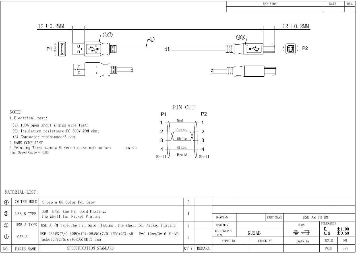 - Konektory: USB 2.0 typ A (male) – USB 2.0 typ B (male)