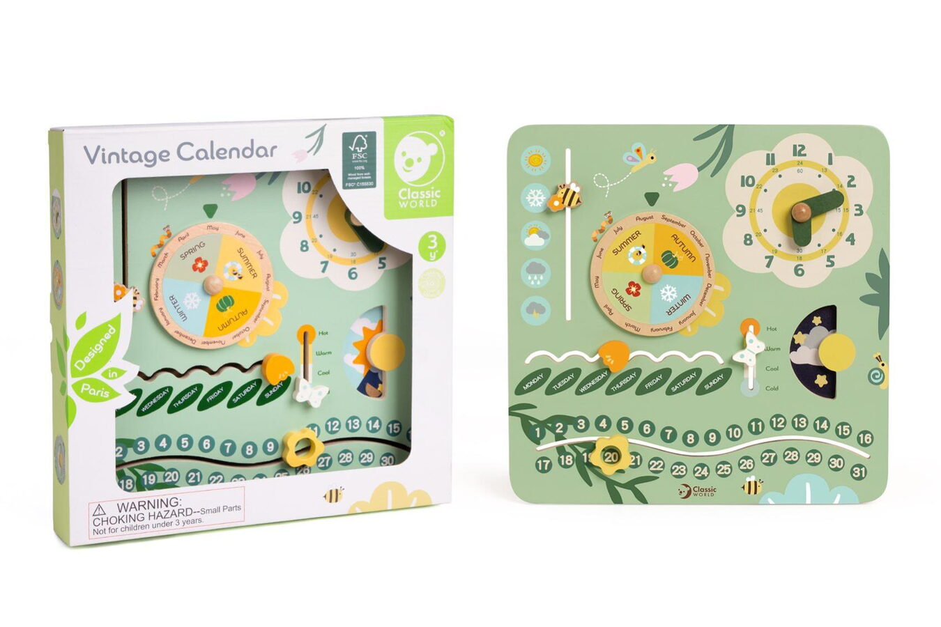 Stylový dřevěný kalendář v anglickém jazyce je skvělým pomocníkem pro výuku času, ročních období, dnů v týdnu i základních anglických slovíček. Děti si mohou každý den samy nastavit datum, měsíc, počasí nebo den v týdnu pomocí otočných a posuvných prvků. Barevné provedení je přehledné a zábavné, ideální pro domácí učení i do školky. Hračka rozvíjí slovní zásobu, orientaci v čase i samostatnost.