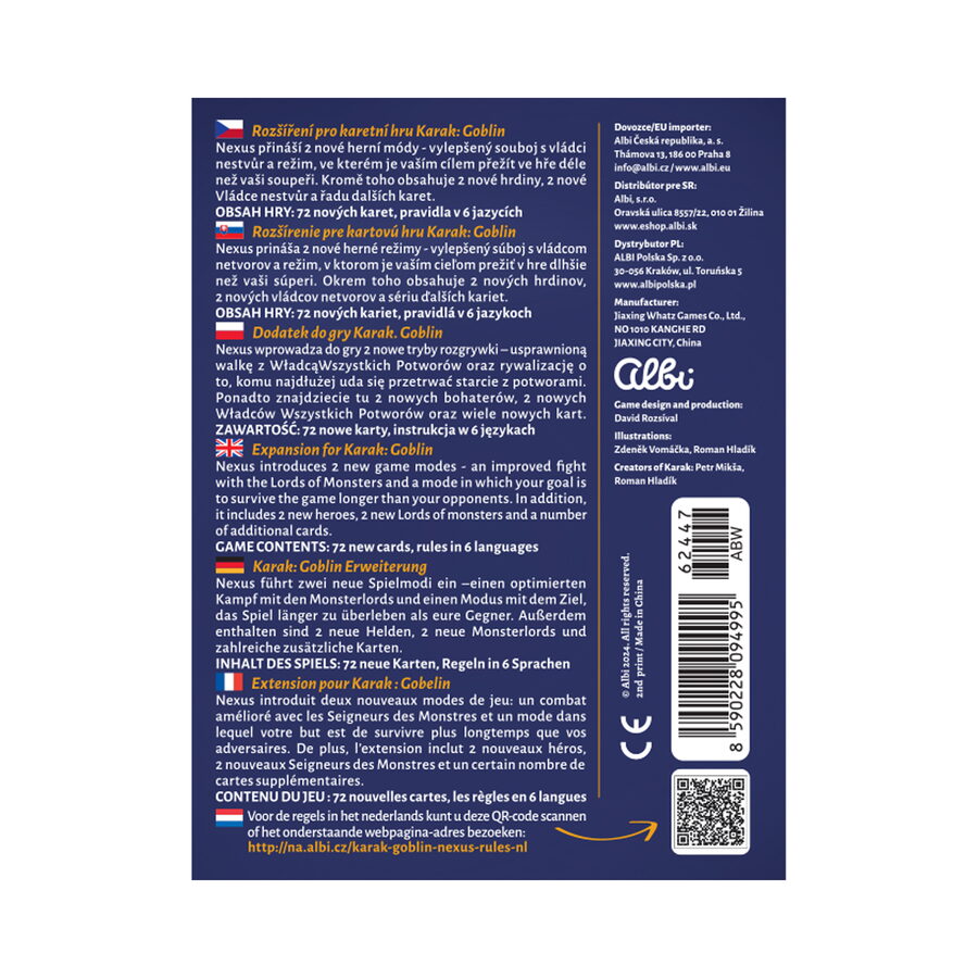Karak: Goblin - Nexus od Albi je rozšíření pro karetní hru Karak: Goblin. Rozšíření přináší dva nové herní režimy, hra je tak rychlejší a napínavější. Hra obsahuje: 5 karet bossů, 27 akčních karet bossů, 2 karty hrdinů, 4 karty lektvarů, 12 startovních karet hrdinů, 10 karet modifikátorů, pravidla v několika jazycích.