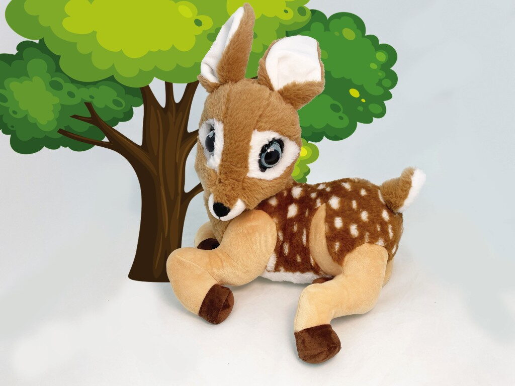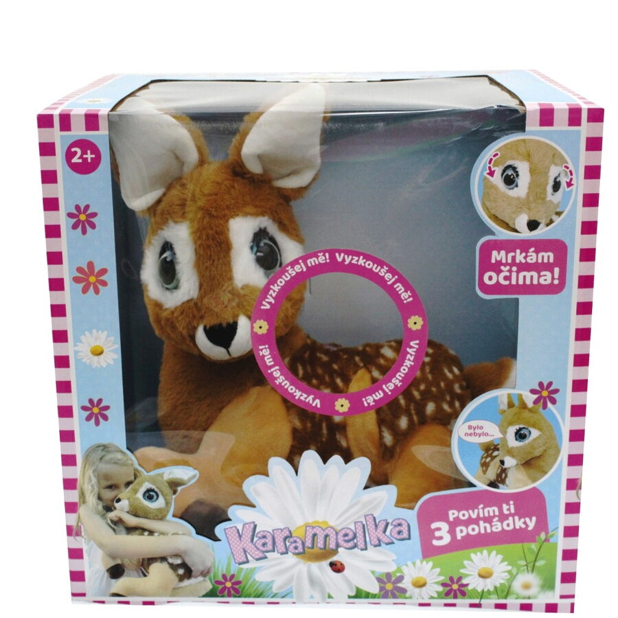 Karamelka ti poví 3 pohádky (Popelka, Zlatovláska a tři medvědi, Na vlásku). Karamelka a mrká očima. Velikost 36cm.