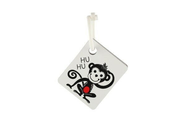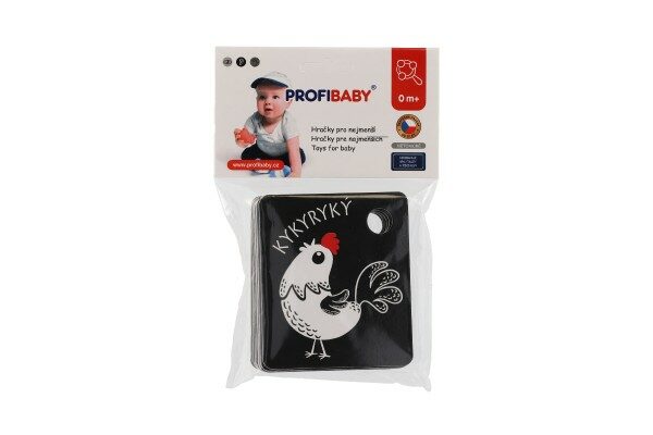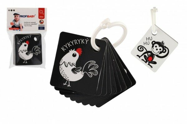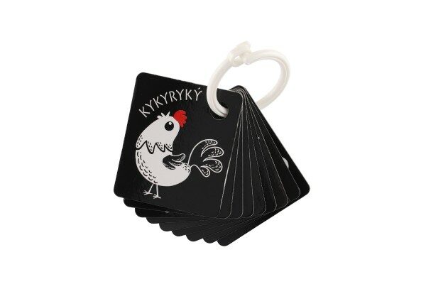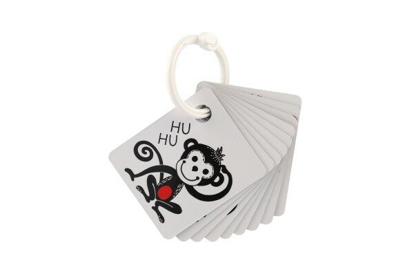 Oboustranné černobílé kartičky s obrázky zvířátek s barevným prvkem. Sada také obsahuje plastový komponent k zavěšení či spojení více kartiček. V balení najdete 9 oboustranných kartiček.