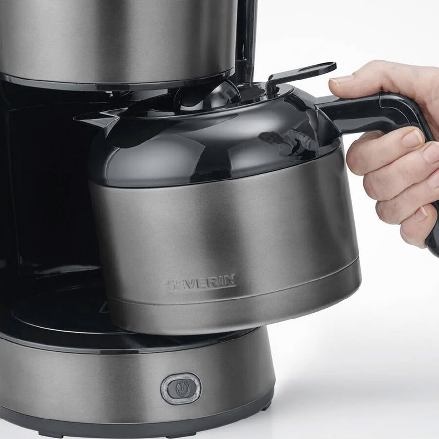 - termokonvice z nerezové oceli s odkapávacím víkem pro udržení teploty kávy a praktické ovládání jednou rukou