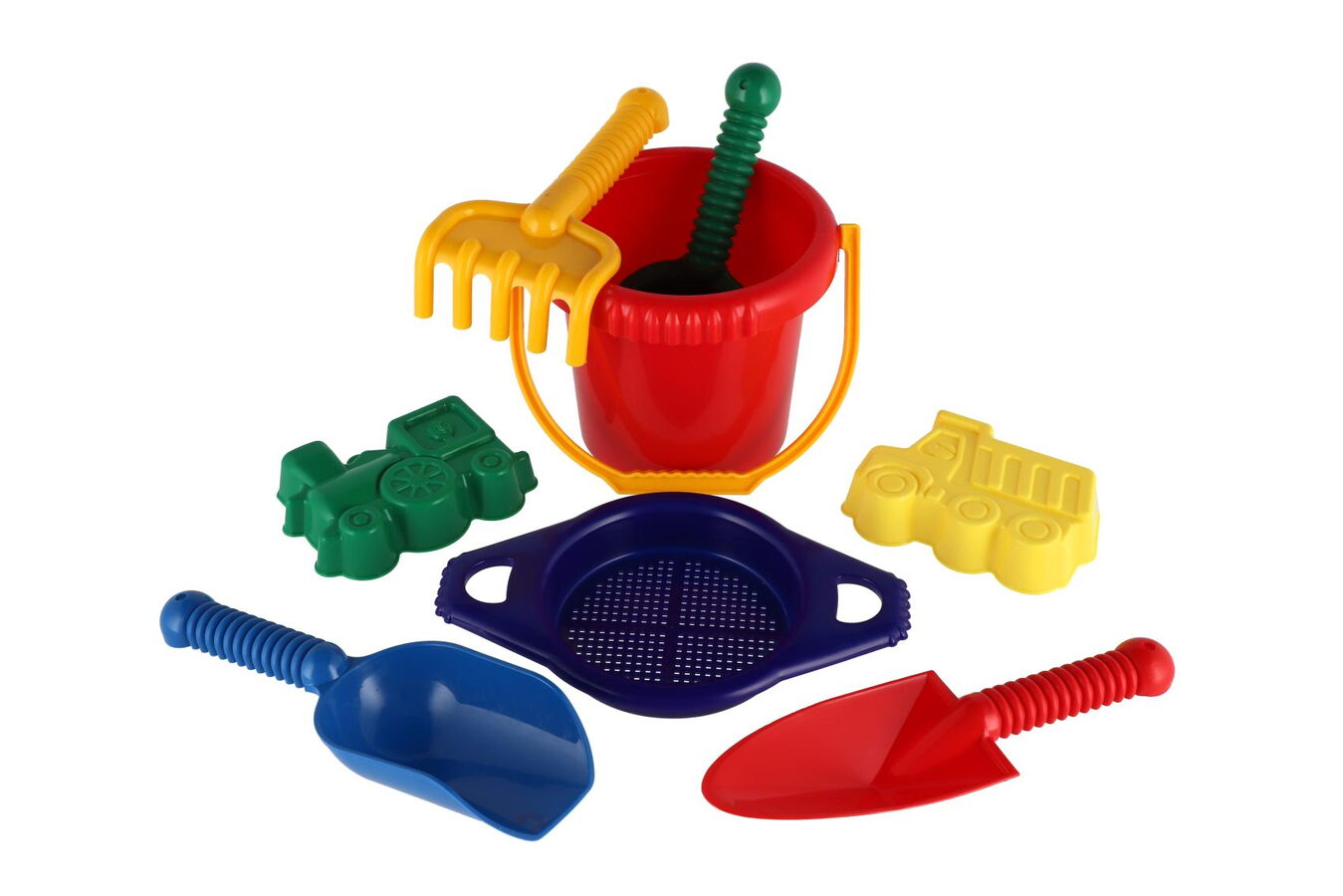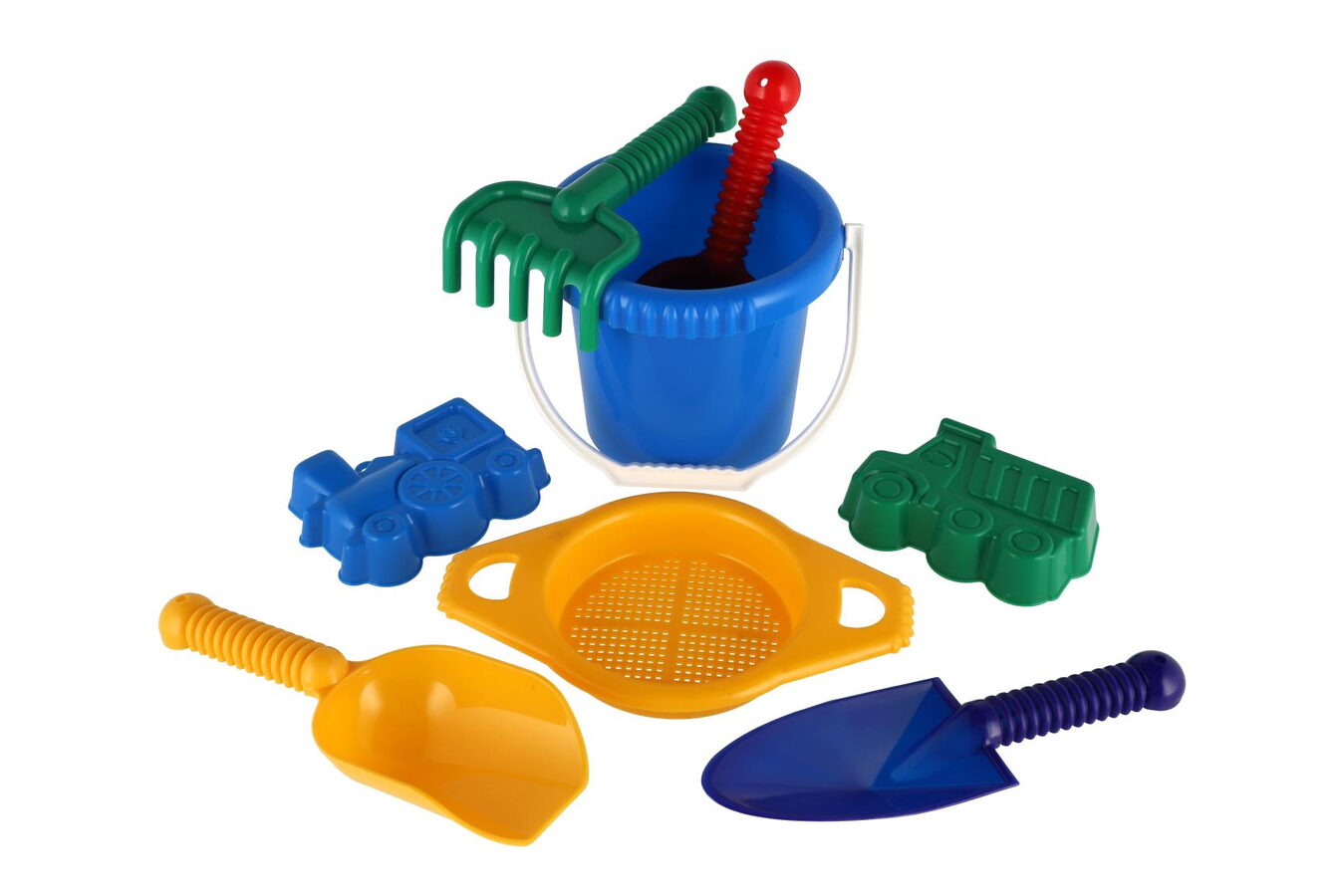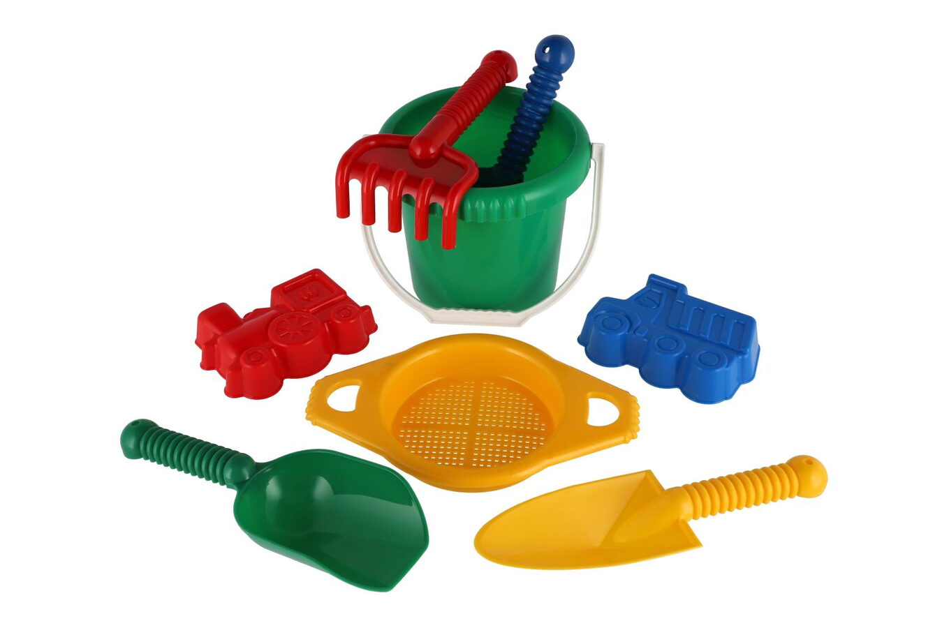 Plastová sada na písek. Sada obsahuje kbelík, sítko, lopatky, hrabičky a 2 bábovky.