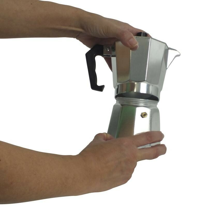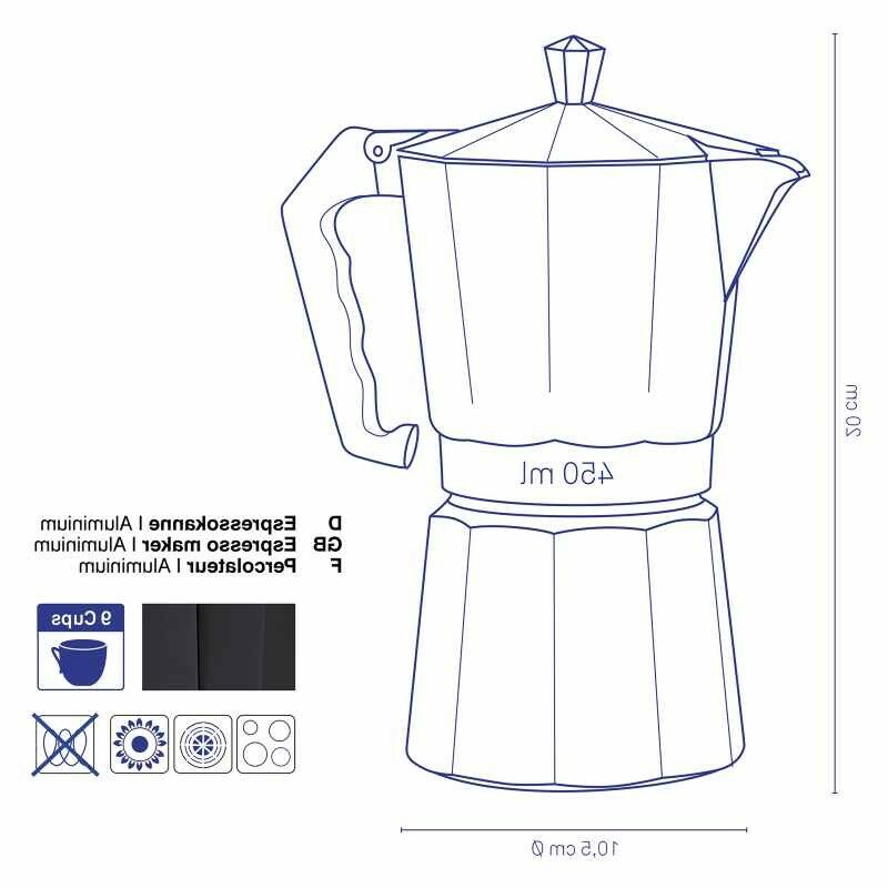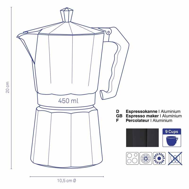 Klasika mezi kávovary: konvička na espresso ITALIA vyrobená z hliníku v černé barvě. Příprava espressa nemůže být snazší: nalijte vodu a kávu do konvice na espresso ITALIA, položte na sporák a za chvíli je espresso hotové: se správným aroma kávy, horké a lahodné. Na 9 šálků (450 ml). Vhodné pro elektrický sporák, sklokeramickou desku, plynový sporák, Radiant.Hliník 10,5 cm, 20 cm v na 9 šálků