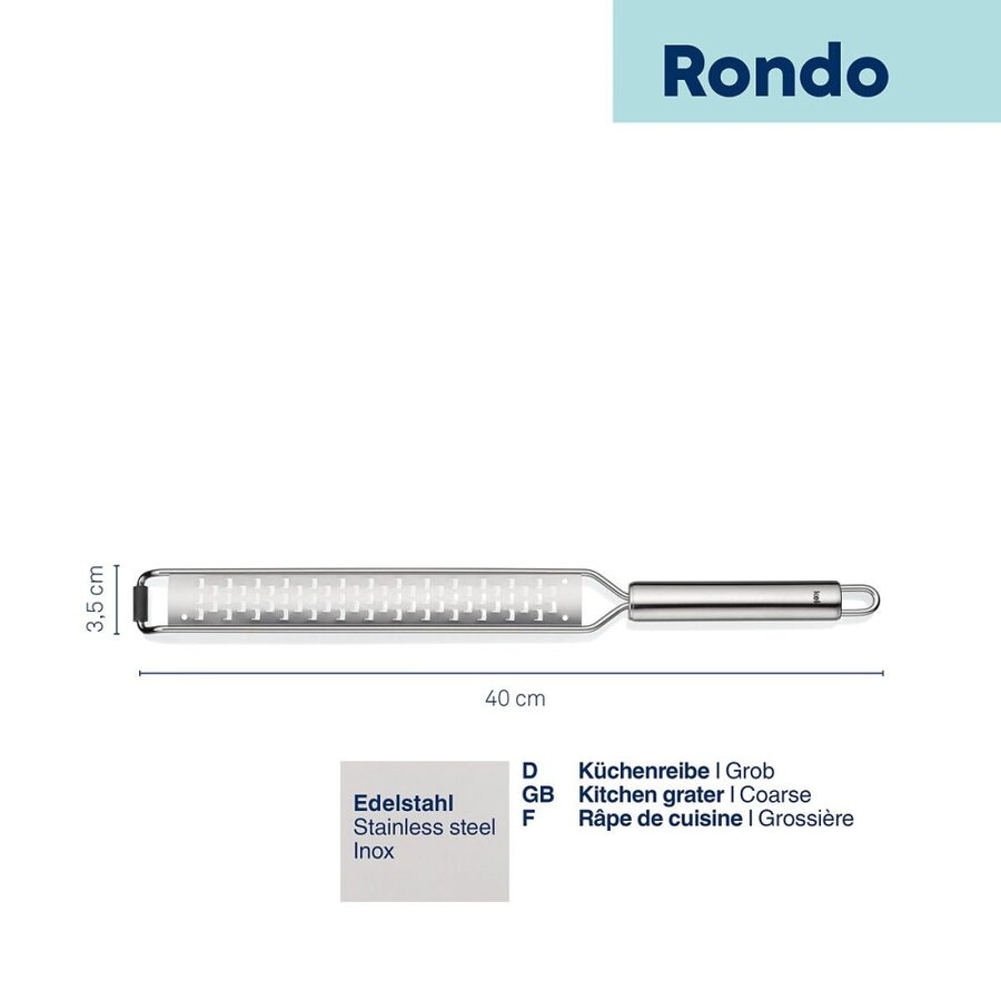 Struhadlo na sýr Rondo od značky KELA je vyrobeno z kvalitní nerezové oceli a nabízí elegantní a praktické řešení pro strouhání sýrů a dalších ingrediencí. Jeho dlouhá rukojeť a dostatečná velikost umožňují pohodlné a efektivní strouhání i větších množství surovin. Díky vysoce kvalitnímu nerezovému materiálu je struhadlo odolné, snadno se čistí a dlouho vydrží.