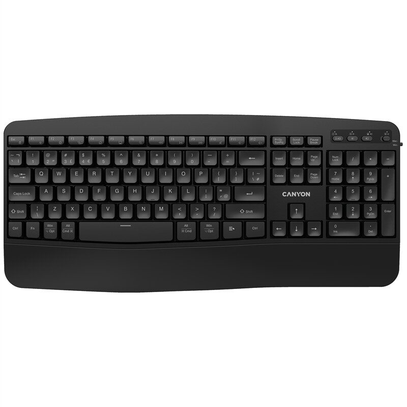 Canyon HKB-W6 je ideální volbou pro každodenní práci i domácí použití – kombinuje ergonomii, bezdrátovou svobodu a praktické funkce v kompaktním provedení. Díky duálnímu připojení přes 2,4 GHz a Bluetooth snadno obsloužíte až tři zařízení najednou. Membránové spínače zajišťují tiché a pohodlné psaní, zatímco integrovaná opěrka zápěstí zvyšuje komfort při dlouhodobém používání. Klávesnice je navržena s důrazem na spolehlivost – odolnost proti polití a dlouhá výdrž baterie vás podrží i při náročném dni.