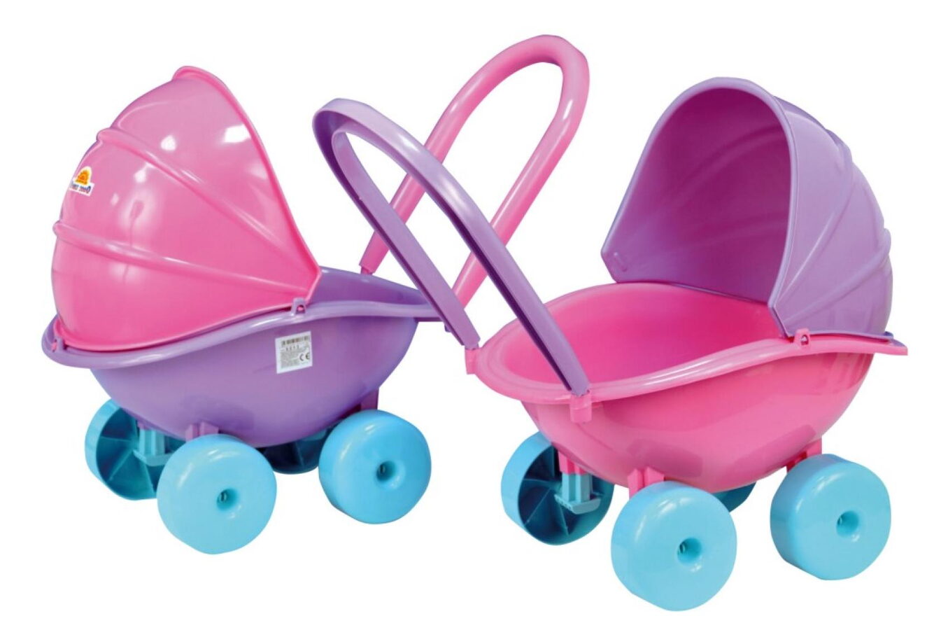 Dětský plastový kočárek pro panenky v růžovo-fialové kombinaci si zamiluje každá malá maminka.