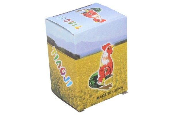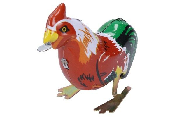 Pohyb plechového kohoutka zajišťuje pérový strojek natahovaný klíčkem.