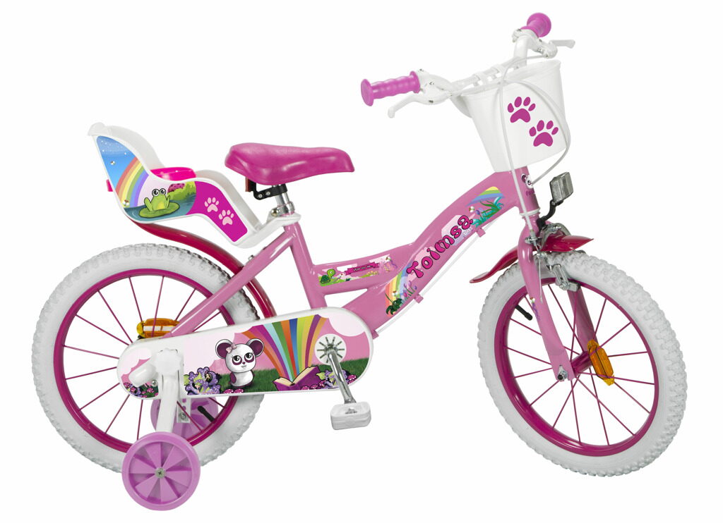 Dětské šlapací kolo Toimsa Fantasy růžovo/bílé 16". Vybaveíní kola – lakovaný rám, přední a zadní brzda, odrazka, nastavitelná řídítka a sedlo, přední a zadní blatník, odrazky, přední košíček a zadní sedačka pro panenky, odnímatelná stabilizační kolečka, nafukovací kola a kryt řetězu. Vhodné pro děti od pěti do sedmi let.