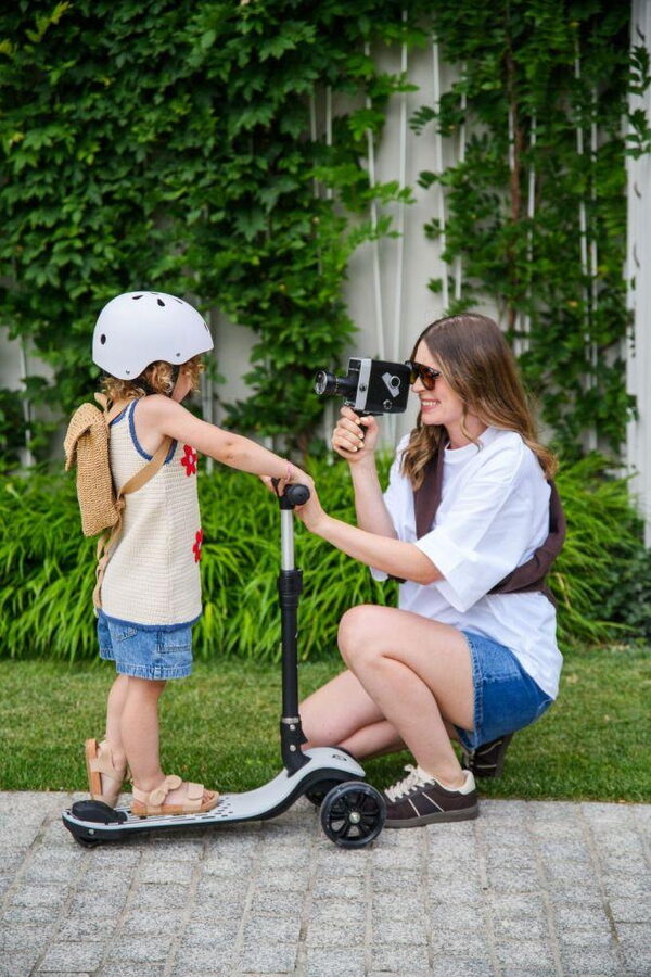 Rodiče ocení skládací rám – stačí stisknout jediné tlačítko a koloběžka je během chvíle připravena na cestu nebo uložení.